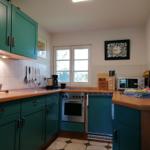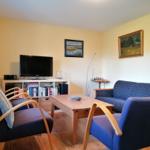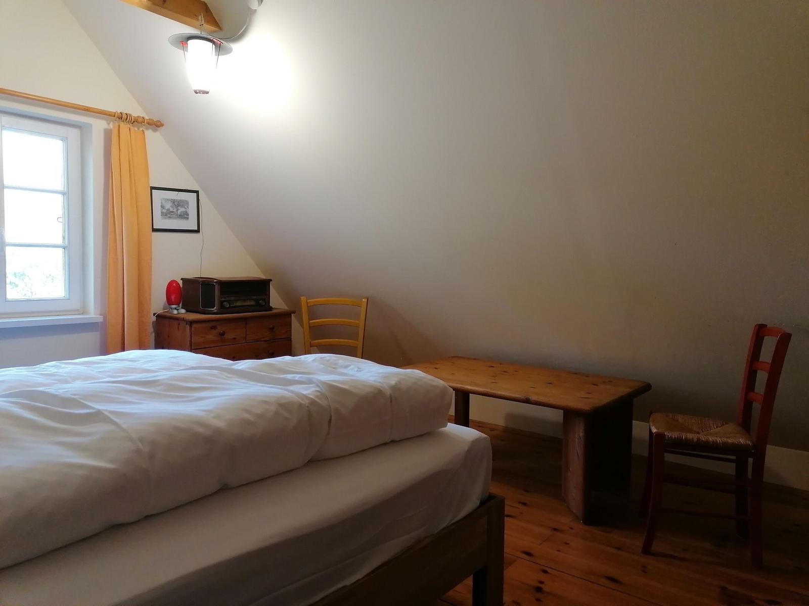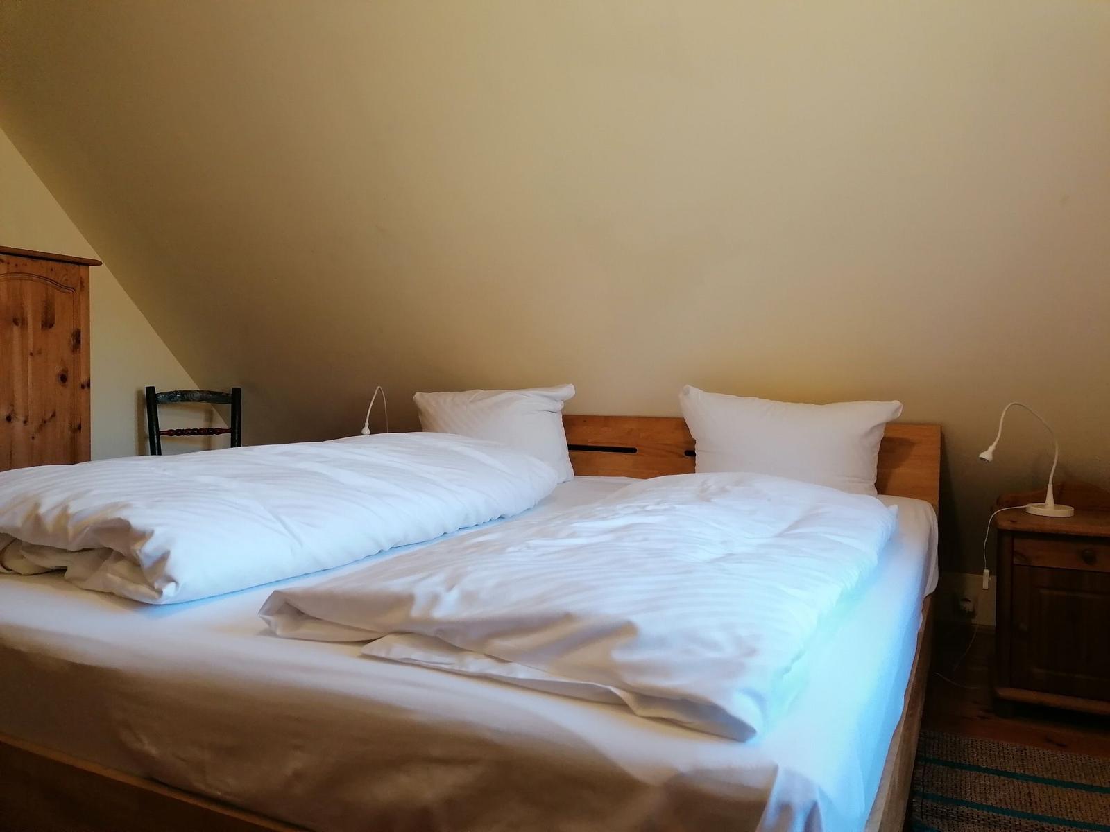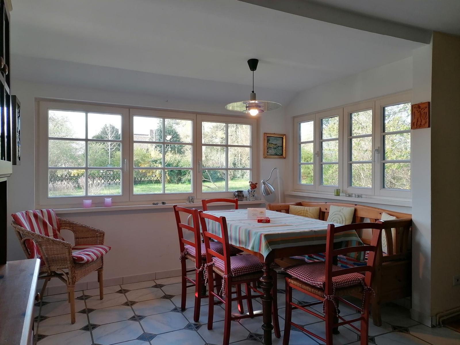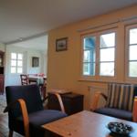 Das Ferienhaus "Zum hohen Ufer" bietet auf ca. 82 m² Wohnfläche Platz für 2-6 Personen. Im Erdgeschoss befindet sich eine Wohndiele mit Essbereich, ein Schlafraum mit zwei Einzelbetten (Länge 1,90 m) sowie eine Küche, die mit einem Geschirrspüler, Ceran-Kochfeld und Backofen ausgestattet ist. Zudem stehen zwei Bäder mit Dusche und WC zur Verfügung. Im Obergeschoss gibt es einen weiteren Schlafraum mit zwei Einzelbetten und einen Schlafraum mit einem Doppelbett. Die Einrichtung ist individuell und rustikal, wobei ein antiker Kachelofen als Dekoration dient. Ein TV-Sat und eine Stereoanlage mit CD sind ebenfalls vorhanden, jedoch steht kein WLAN zur Verfügung. Bettwäsche ist einmalig pro Person inklusive, und ein PKW-Stellplatz ist vorhanden. Strom und Gas werden nach Verbrauch berechnet.