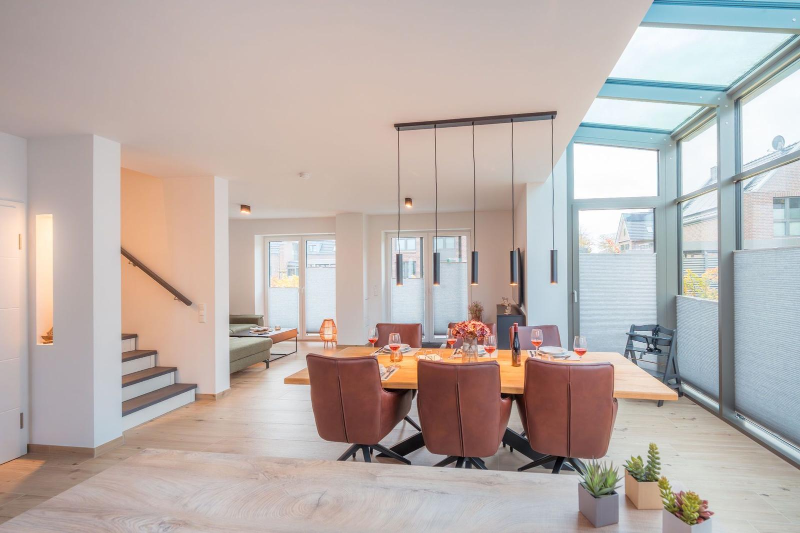 Das Strandhaus 53° Nord bietet einen attraktiven Außenbereich, der zum Entspannen im Freien einlädt. Die schöne Terrasse ist mit bequemen Gartenmöbeln ausgestattet und lädt zum Verweilen ein. Darüber hinaus steht ein Wintergarten zur Verfügung, der ganzjährig genutzt werden kann. Eine Markise und Fliegengitter sorgen für zusätzlichen Komfort und ungestörte Stunden im Freien. Das Grundstück ist kinderfreundlich und auch Haustiere sind erlaubt. Ein kostenfreier PKW-Stellplatz ist direkt am Haus reserviert, zudem kann ein E-Ladestation für Elektroautos hinzugebucht werden. Die Lage des Strandhauses ermöglicht zudem zahlreiche Freizeitmöglichkeiten in der Umgebung, einschließlich Radfahren und Minigolf. So wird der Aufenthalt an der Nordsee zu einem unvergesslichen Erlebnis.