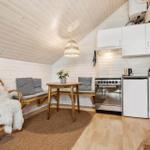Ein großes Wohnschlafzimmer mit Smart-TV und Kamin schafft eine einladende Atmosphäre. Die voll ausgestattete Küche verfügt über einen Elektro-/Gasherd, Backofen, Geschirrspüler und Kühlschrank sowie eine Mikrowelle, Kaffeemaschine und Wasserkocher. Für zusätzlichen Komfort sorgen eine Waschmaschine, Bügeleisen und Fußbodenheizung.