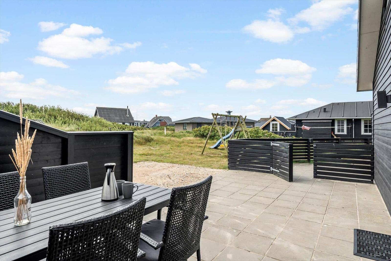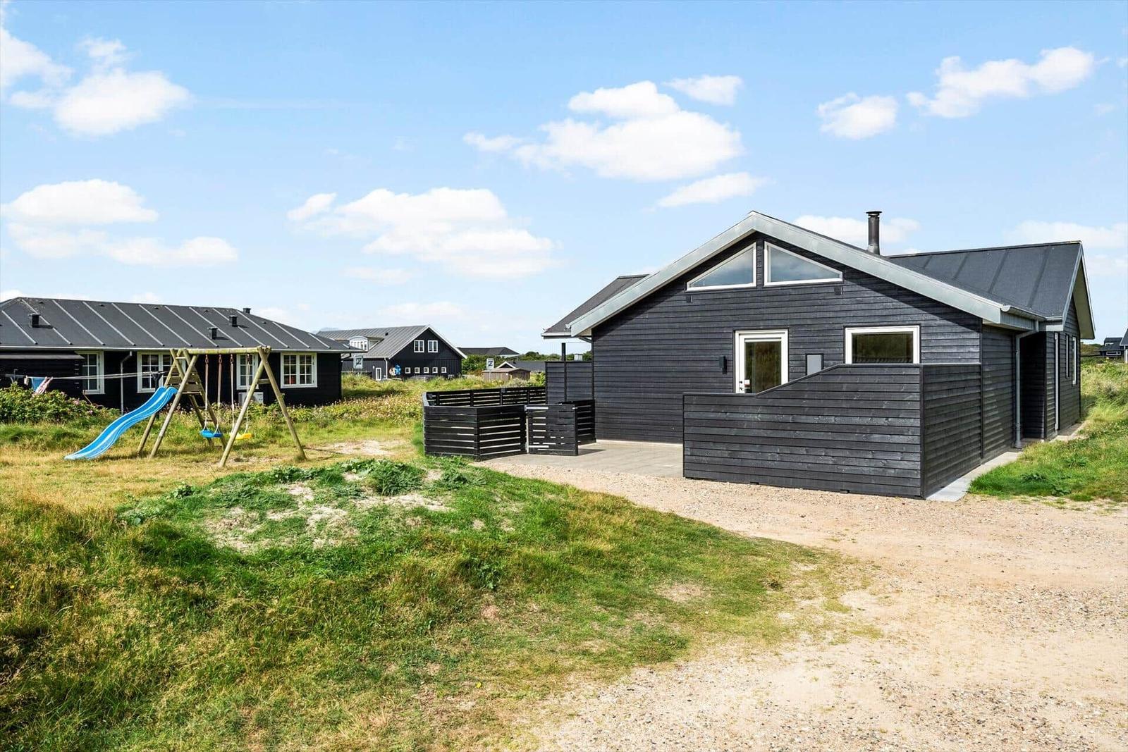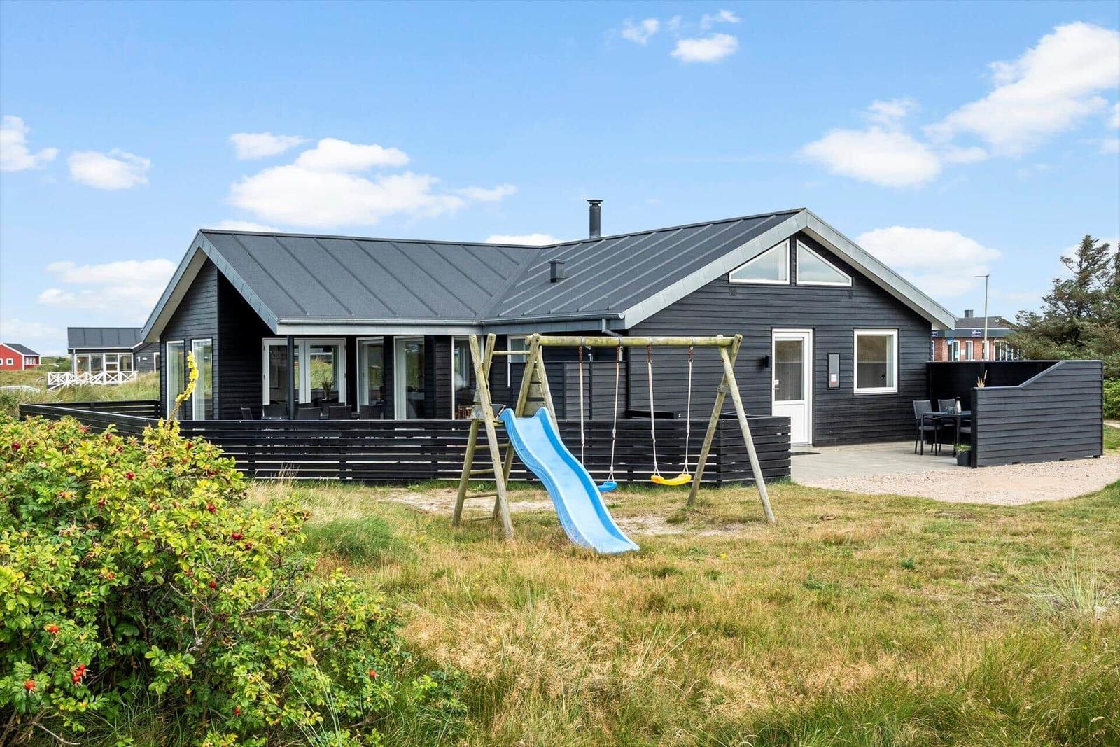 Zusätzliche Annehmlichkeiten wie WLAN, TV, Waschmaschine, Wäschetrockner und Fußbodenheizung sorgen für höchsten Komfort. Der Außenbereich bietet ein 1.400 m² großes Grundstück mit Schaukel und Sandkasten, ideal für erholsame Tage in der Nähe des Strandes.