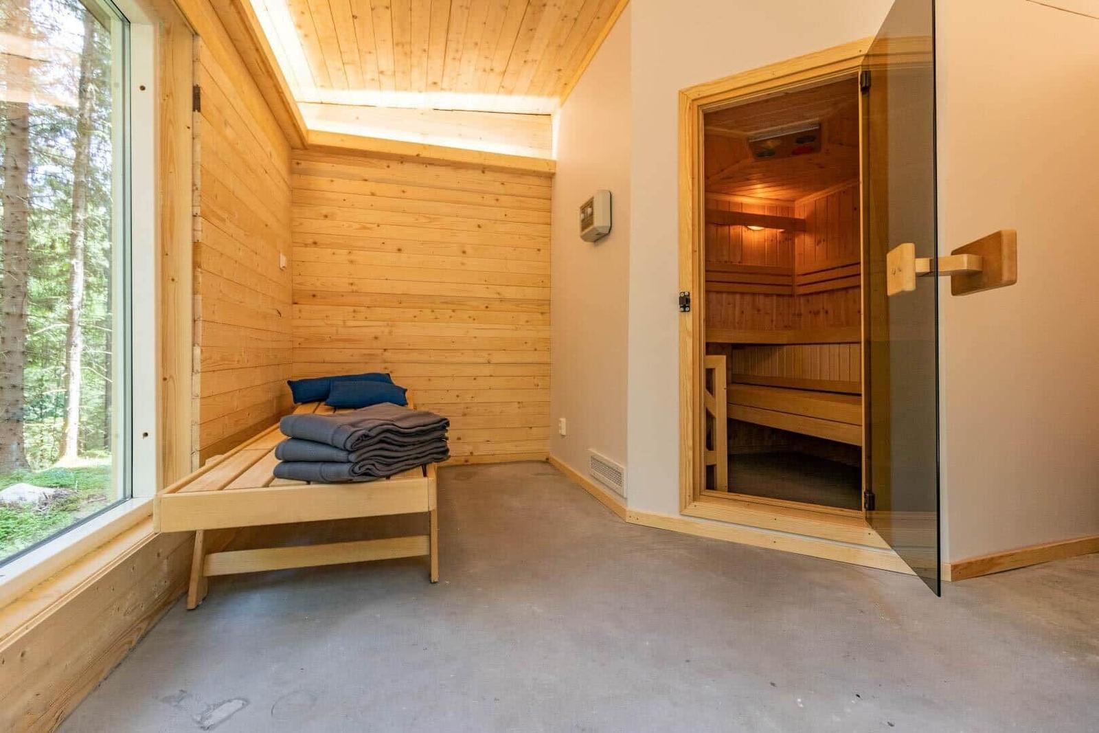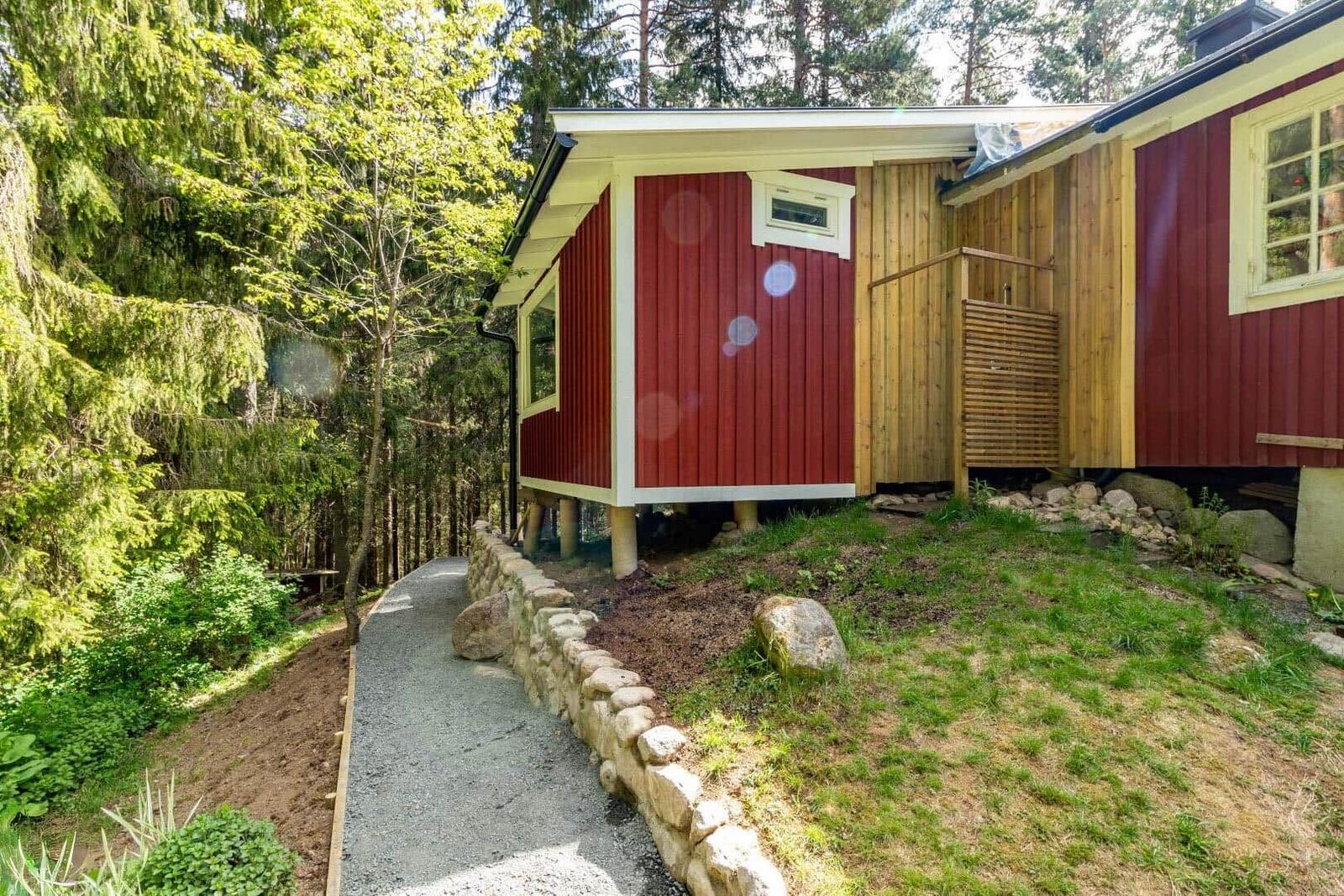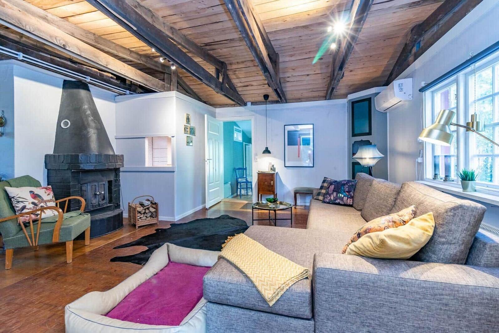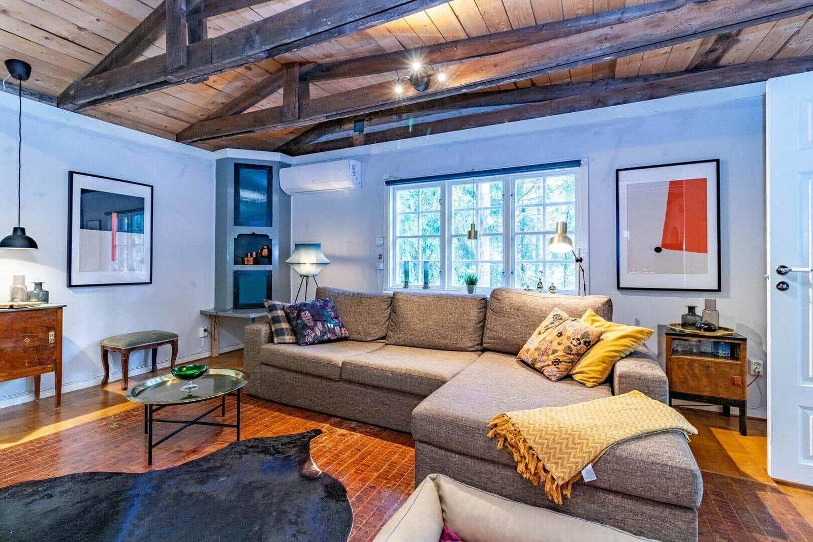 Das Ferienhaus Hvilan bietet auf etwa 60 m² Wohnfläche eine gemütliche Unterkunft für einen entspannten Aufenthalt. Es verfügt über ein Schlafzimmer mit Doppelbett sowie ein zusätzliches Schlafzimmer im Gästehaus mit einem Einzelbett und einer Matratze. Im Haupthaus gibt es ein einladendes Wohnzimmer mit Kamin, Schlafsofa, Fernseher und Internetzugang. Die vollständig eingerichtete Küche ist mit einem 2-Platten-Kocher, Kühl-/Gefrierkombination, Spülmaschine, Mikrowelle und Kaffeemaschine ausgestattet. Das moderne Badezimmer beinhaltet Dusche, WC, Badewanne und Waschmaschine. Eine Luftwärmepumpe sorgt für angenehme Temperaturen. Gemeinschaftlich nutzbare Einrichtungen umfassen die Sauna, die sich seitlich des Hauses befindet. Zudem steht ein Ruderboot zur Verfügung, um den See zu erkunden. Parkplatzmöglichkeiten sind auf dem Grundstück vorhanden.