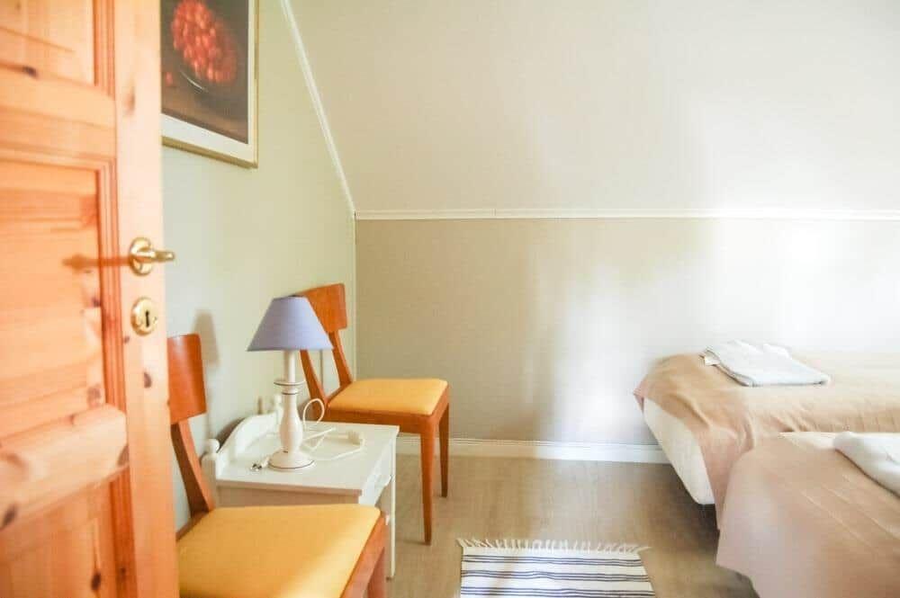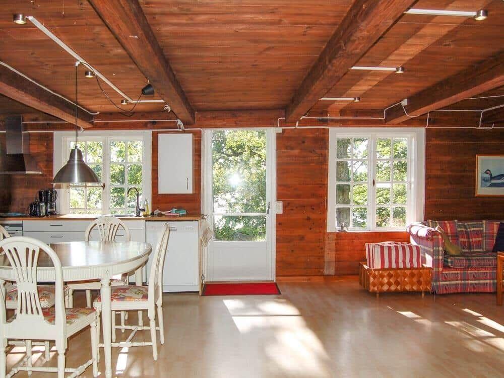 Das charmante Holzhaus in schwedischem Stil bietet einen offenen Wohnbereich von etwa 45 m² im Erdgeschoss, der eine integrierte Küche mit moderner Ausstattung, einschließlich Elektroherd, Kühlschrank und Geschirrspüler, umfasst. Ein Essplatz mit offenem Kamin ergänzt dieses Raumkonzept. Im Obergeschoss befinden sich zwei Schlafzimmer, eines mit Doppelbett und das andere mit zwei Einzelbetten, sowie ein zweites Badezimmer mit WC und Handwaschbecken. Weitere Einzelbetten stehen bis zum 31.08.2025 in der Diele zur Verfügung. Das Erdgeschoss verfügt außerdem über ein Badezimmer mit Duschecke. WLAN kann für 10 EUR pro Woche hinzugebucht werden. Eine Pflicht-Endreinigung in Höhe von 120 EUR ist ebenfalls vor Ort zu entrichten. Ein bootsmotorisierbares Ruderboot steht zur Verfügung, und auf Anfrage können Bootsmotor und weitere Boote gemietet werden. Haustiere sind willkommen, Rauchen im Haus ist nicht gestattet.