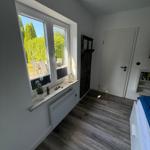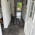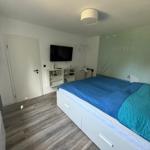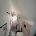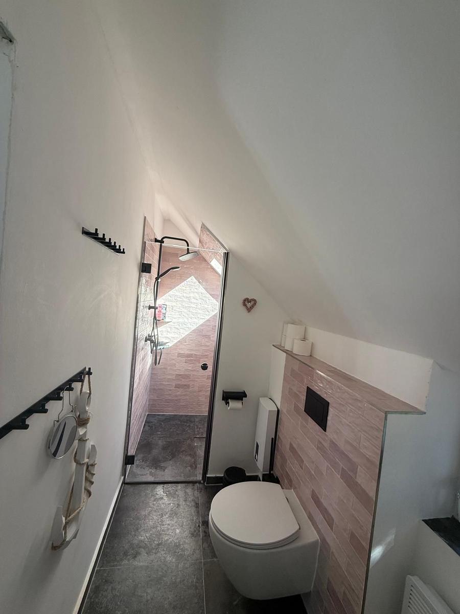 Das Badezimmer bietet eine bodengleiche Dusche, ein Waschbecken, einen Spiegel und WC. WLAN ist verfügbar, Haustiere sind willkommen, und es stehen zwei kostenfreie Privatparkplätze am Haus zur Verfügung. Die Unterkunft ist Nichtraucher-Haus.