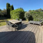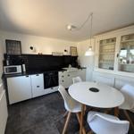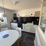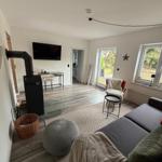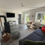 Das Wohnzimmer ist mit einem gemütlichen Sofa, einem Flachbild-TV und einem modernen Ofen ausgestattet, der in kühleren Monaten für wohlige Wärme sorgt. Die geschlossene Küche verfügt über einen Essbereich und ist mit sämtlichen notwendigen Küchenutensilien, Kaffeemaschine, Mikrowelle, Toaster sowie Kühlschrank mit Gefrierfach ausgestattet.