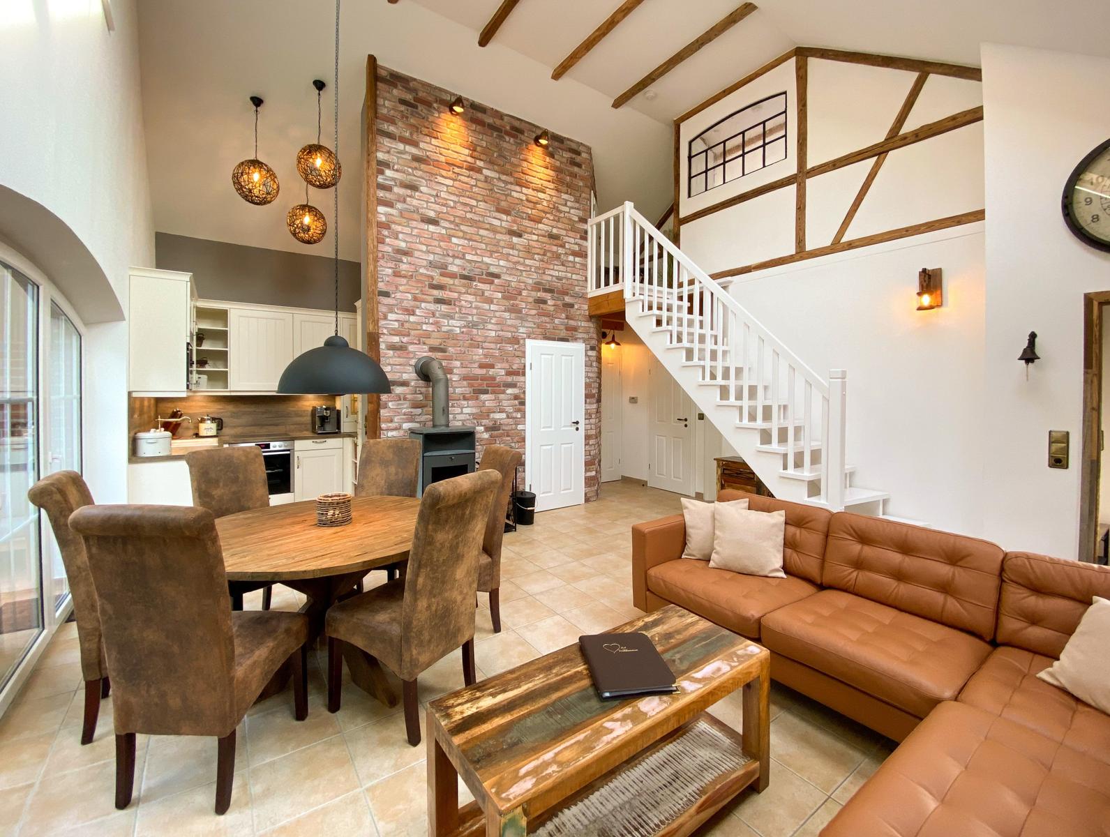 Die Ferienwohnung bietet eine komfortable und moderne Ausstattung, die speziell auf die Bedürfnisse von Gästen ausgelegt ist. Mit drei Schlafzimmern, ausgestattet mit insgesamt drei Doppelbetten, bietet sie Platz für erholsame Nächte. Das offene Wohnkonzept umfasst eine bestens ausgestattete Küche mit Geschirrspüler, Elektro-/Gasherd, Backofen, Mikrowelle und einem Kühlschrank mit Gefriermöglichkeit. Ein gemütliches Wohnzimmer mit Kamin, HiFi-Anlage und TV lädt zum Entspannen ein. Das Badezimmer verfügt über ein Fenster und moderne Annehmlichkeiten wie eine Fußbodenheizung und einen Haartrockner. Für Familien stehen ein Kinderhochstuhl sowie eine Spielekonsole bereit, während WLAN und Parkmöglichkeiten die praktische Ausstattung abrunden. Zusätzlich finden Gäste Waschmaschine, Wäschetrockner und Bügeleisen vor. Diese allergikergeeignete Wohnung ist die ideale Wahl für einen entspannten Aufenthalt.
