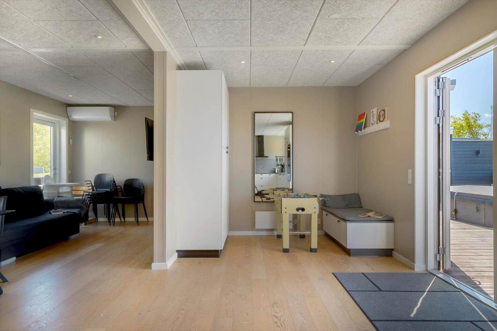 Die offene Küche ist perfekt ausgestattet mit einem Geschirrspüler, Backofen, Mikrowelle, Kühlschrank und einer Kaffeemaschine, sodass kulinarische Genüsse mühelos zubereitet werden können. Das Wohnzimmer bietet einen Smart-TV und gemütlichen Platz zum Entspannen. Praktische Annehmlichkeiten wie Waschmaschine, Wäschetrockner und WLAN sind ebenfalls vorhanden. Die energieeffiziente Heizung sorgt für wohlige Wärme. Zusätzlich lädt die nahegelegene Sauna zum Entspannen ein. Nur 500 Meter bis zum Strand und 4.000 Meter zu den Einkaufsmöglichkeiten runden das Angebot ab.