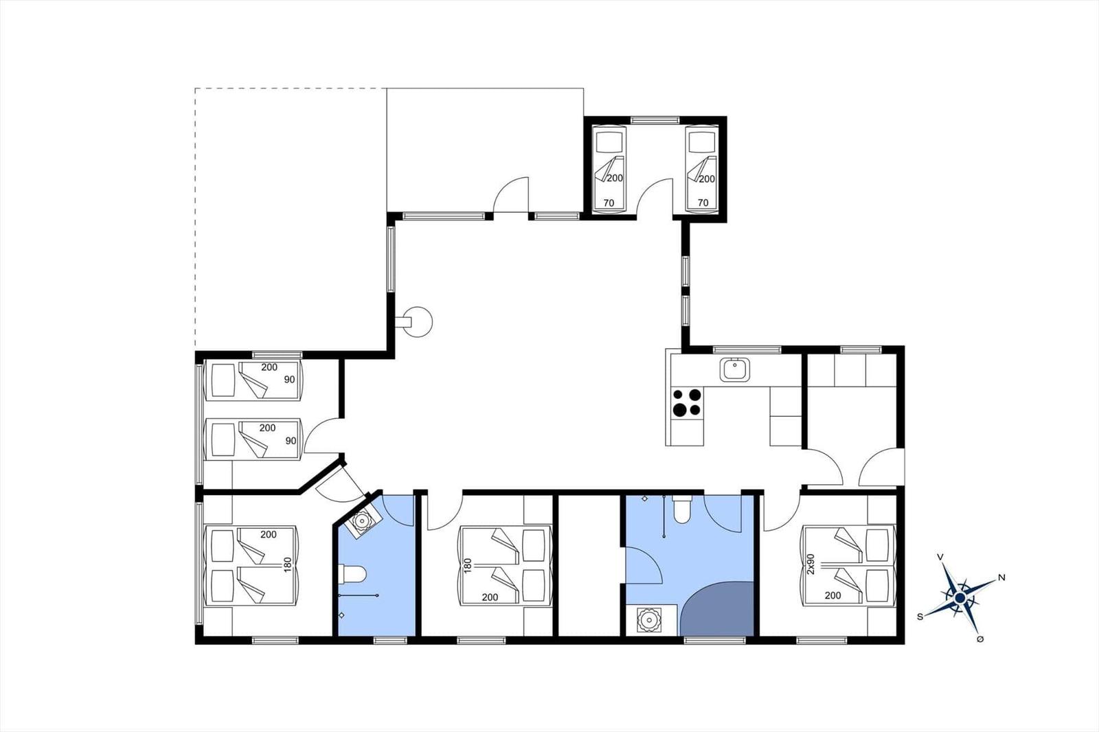 Dieses Ferienhaus in Vejlby Klit, Westjütland, bietet Platz für bis zu 10 Erwachsene und ein Haustier. Auf 113 m² erwarten die Gäste fünf Schlafzimmer, darunter drei Doppelbetten und vier Einzelbetten, sowie vier Kinderbetten. Die zwei modernen Badezimmer sind mit einem Duschbad ausgestattet.