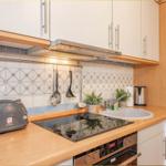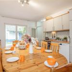 Eine separate Küche ist komplett ausgestattet mit einem Geschirrspüler, Elektro-/Gasherd, Backofen, Mikrowelle, Kühlschrank, Kaffeemaschine, Toaster und Wasserkocher. Der stilvolle Esstisch lädt zu geselligen Mahlzeiten ein.