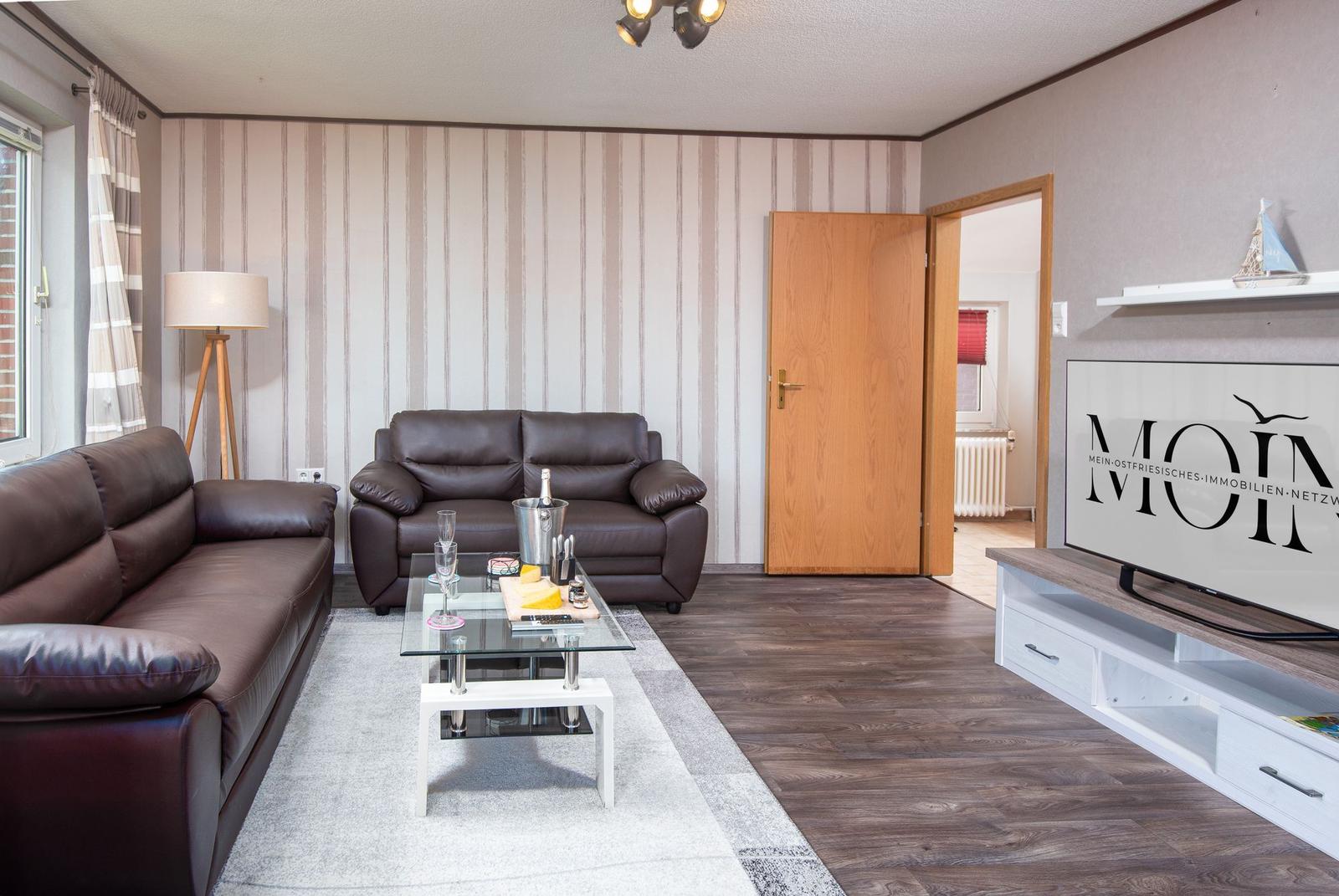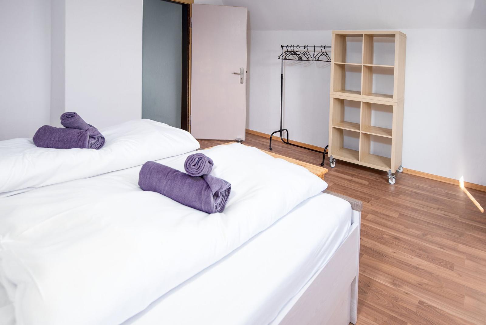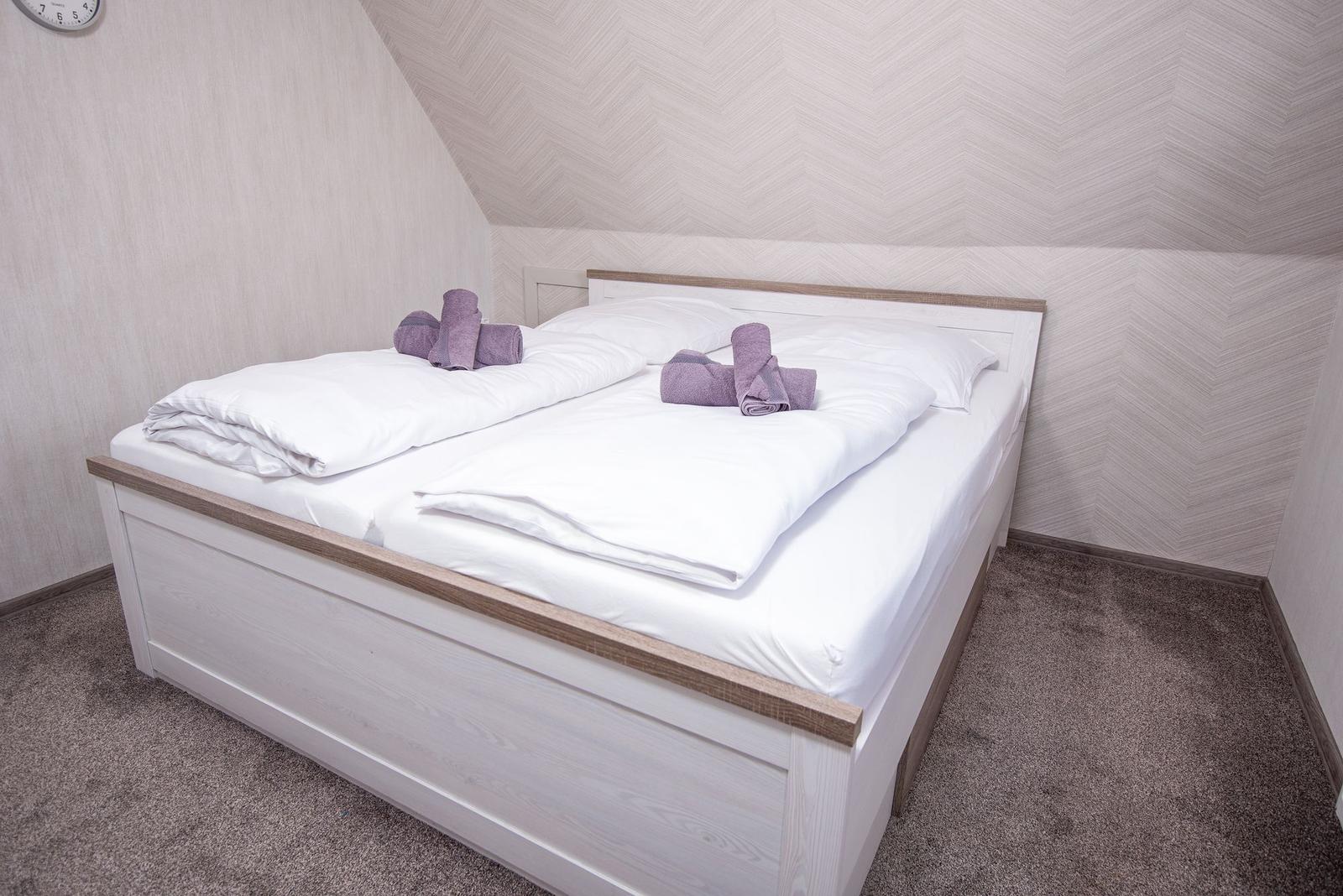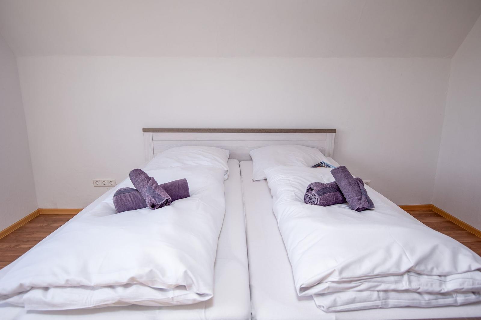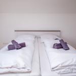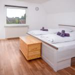 Die Ferienwohnung bietet eine moderne und komfortable Ausstattung, ideal für entspannte Urlaube. Sie verfügt über zwei lichtdurchflutete Schlafzimmer, die jeweils mit einem Doppelbett ausgestattet sind. Ein helles Badezimmer mit Fenster sorgt für frische Luft und ist mit einer Dusche sowie einem Gäste-WC ausgestattet.