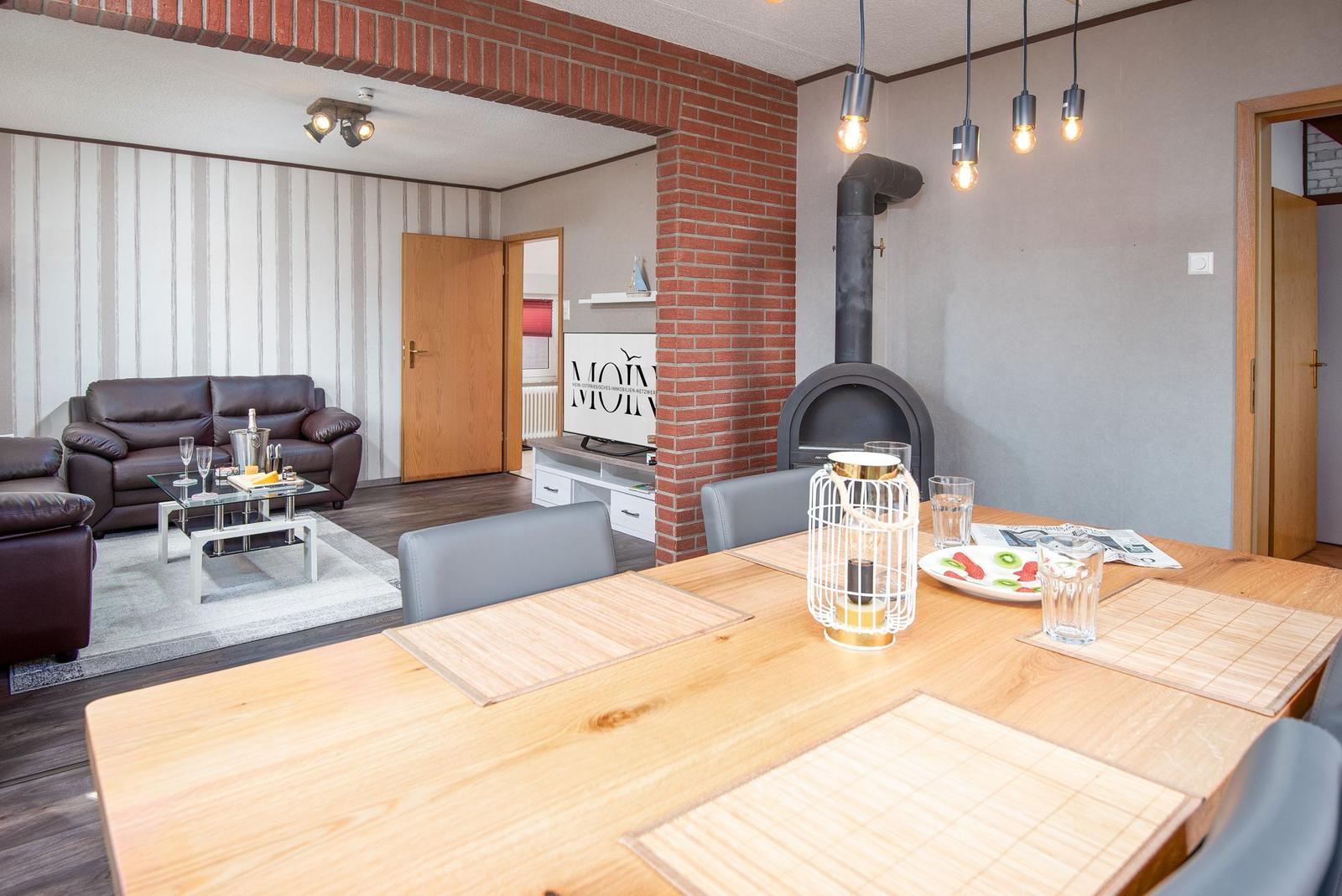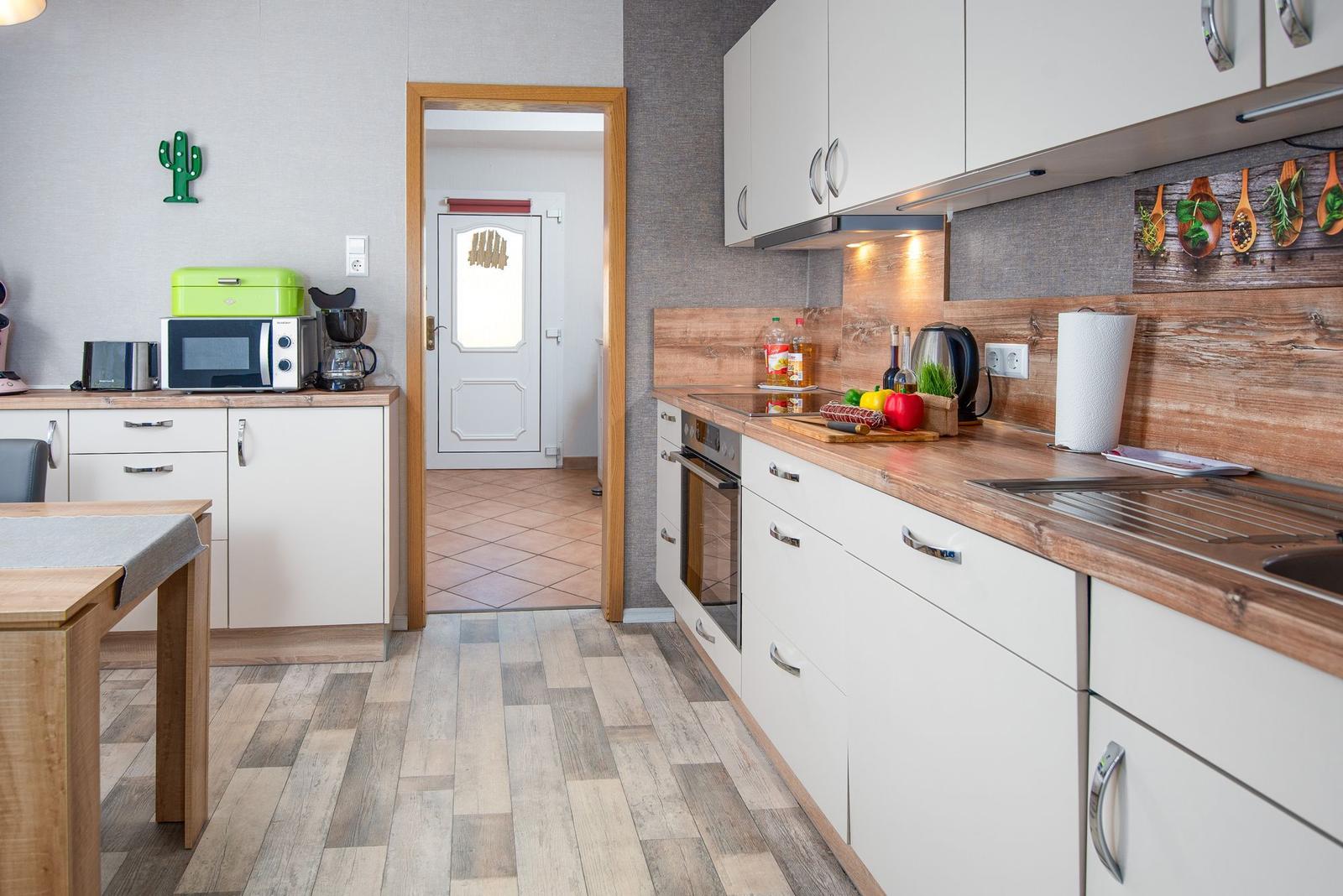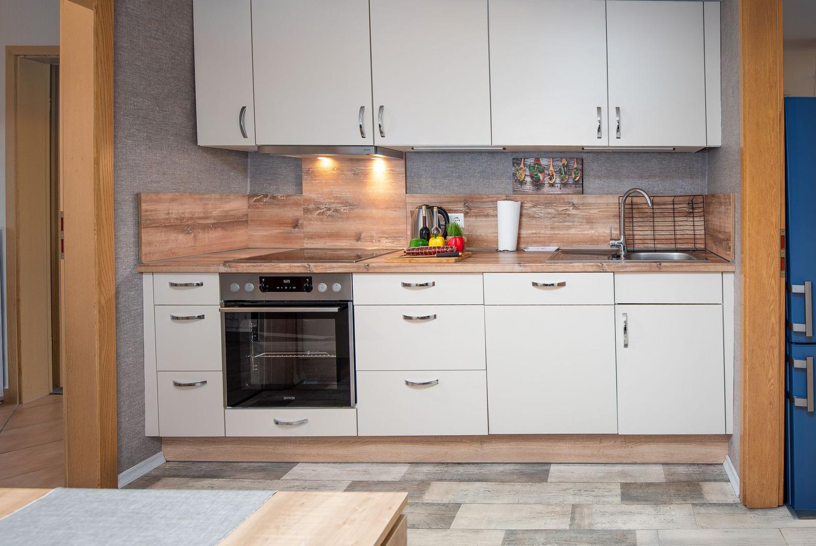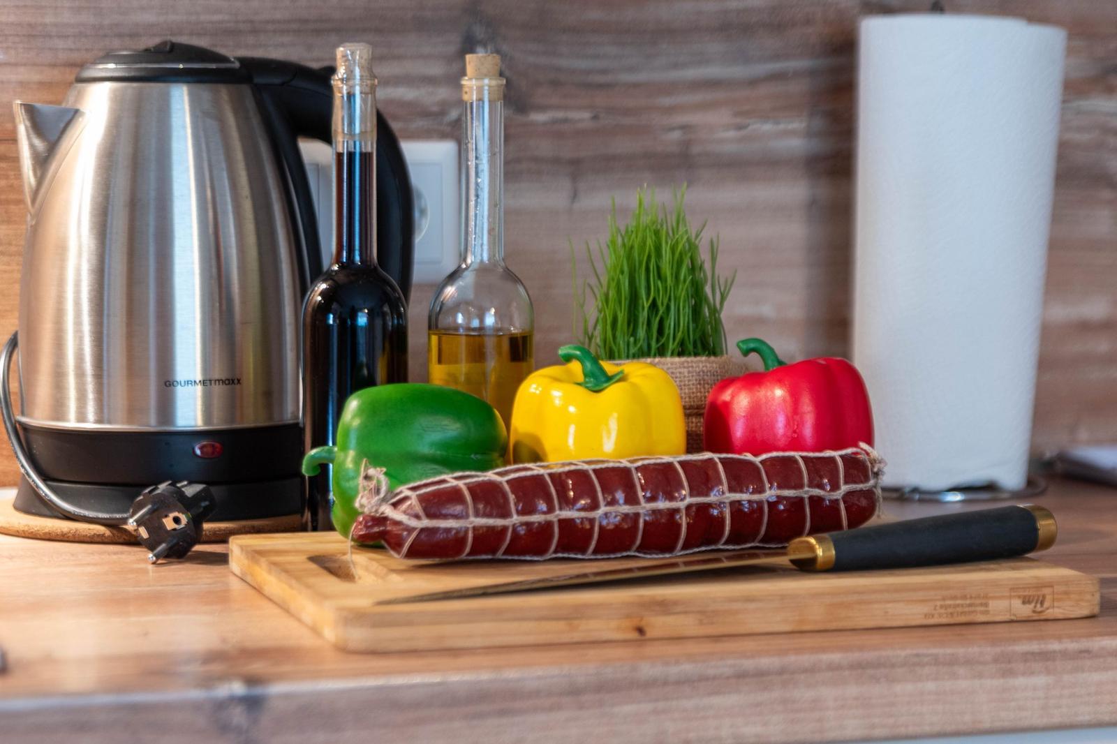 Die offene Wohnküche beeindruckt mit zahlreichen Annehmlichkeiten, darunter ein Elektro- und Gasherd, Backofen, Mikrowelle, Kühlschrank und eine Kaffeemaschine. Ein Esstisch lädt zum gemeinsamen Speisen ein, während im Wohnzimmer ein Sofa zum Entspannen einlädt. Für Unterhaltung sorgt ein TV, und schnelles WLAN ist ebenfalls verfügbar.