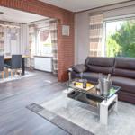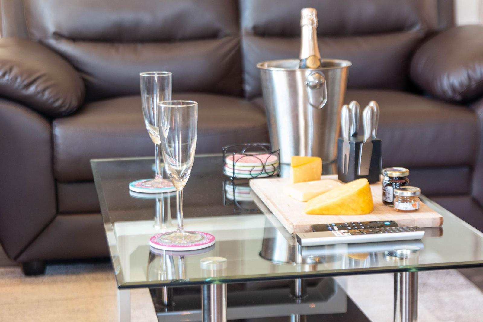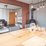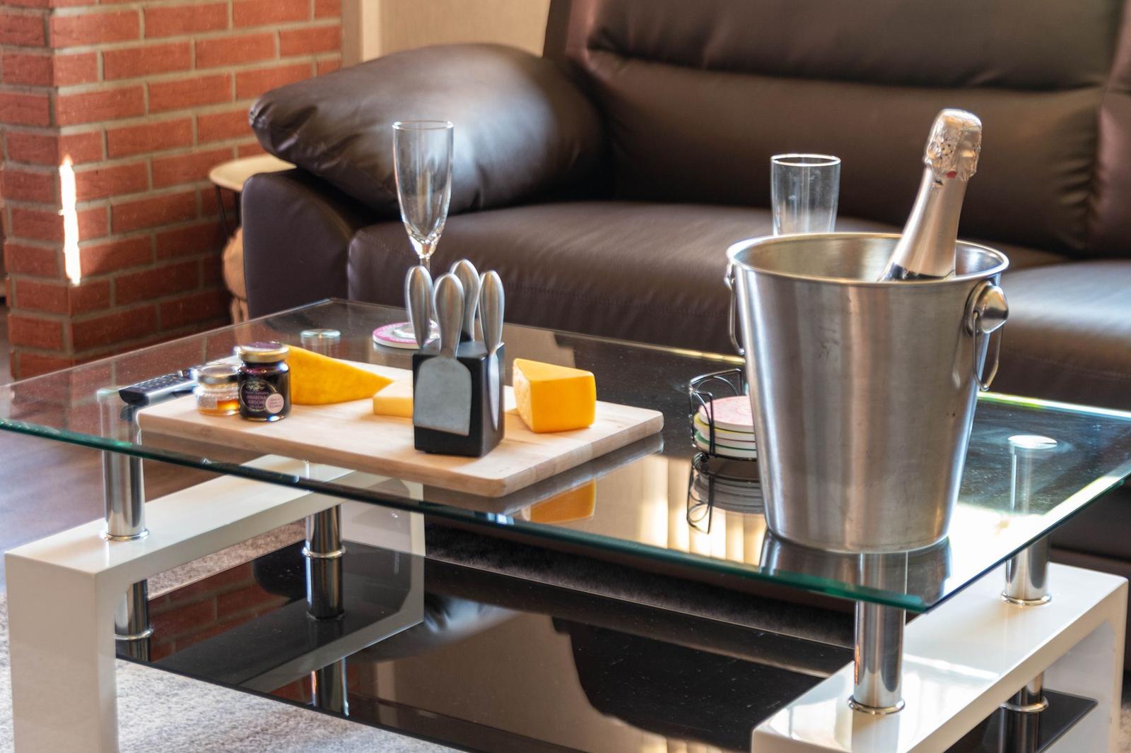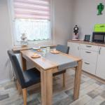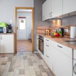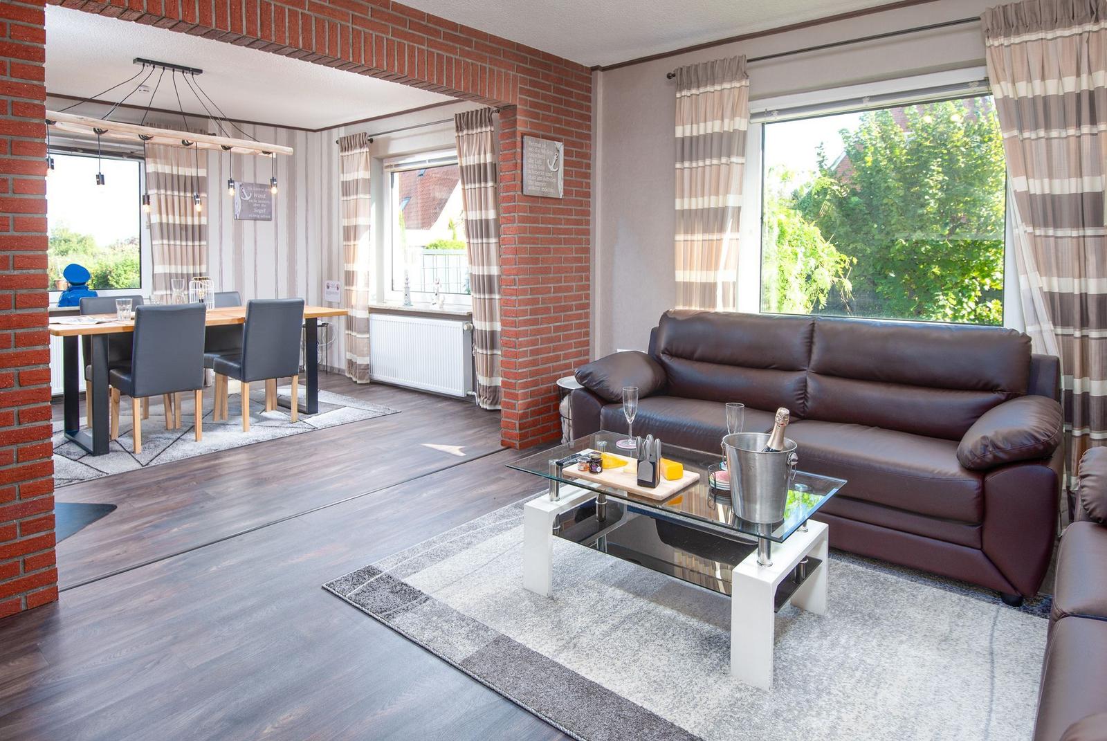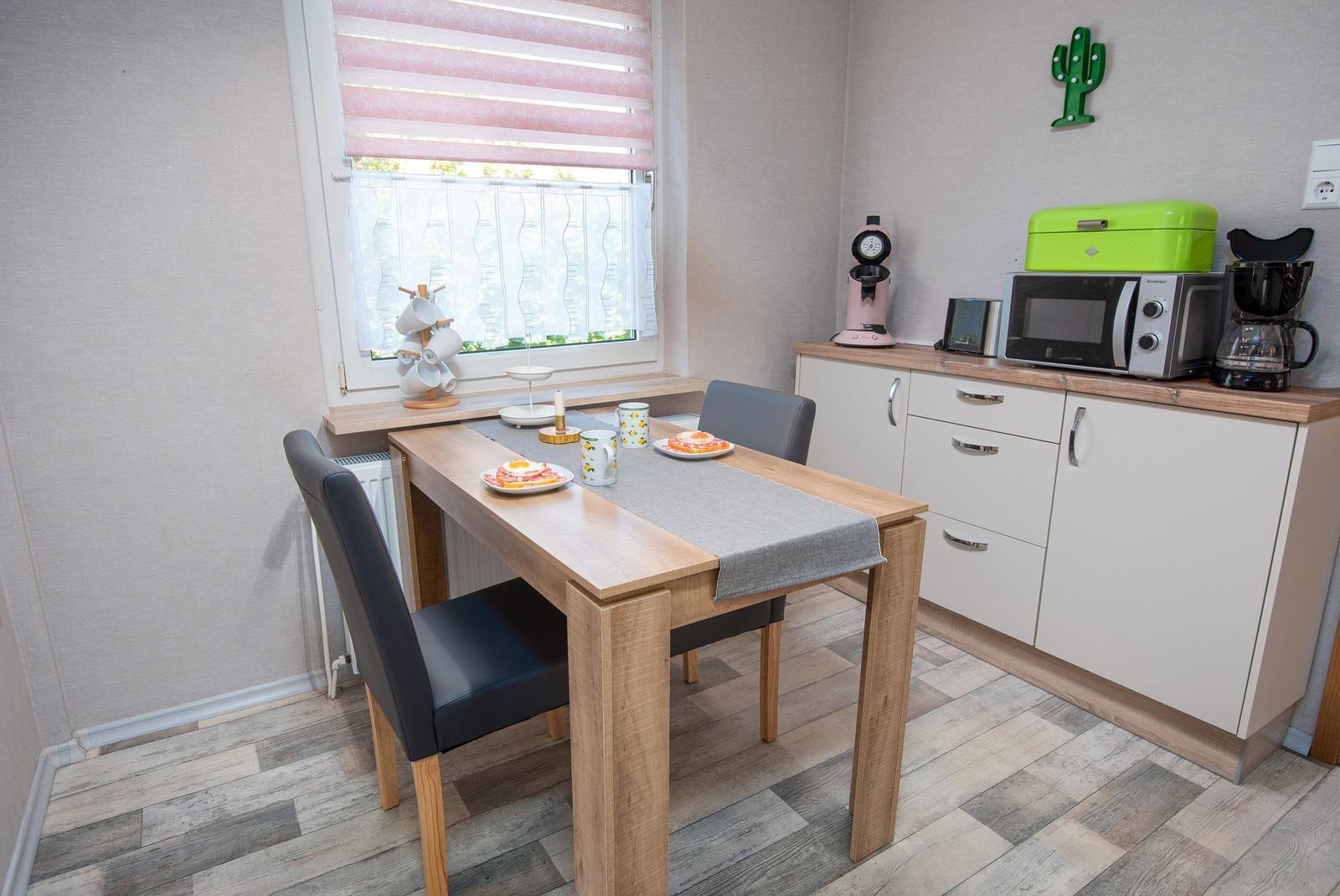 Die offene Wohnküche beeindruckt mit zahlreichen Annehmlichkeiten, darunter ein Elektro- und Gasherd, Backofen, Mikrowelle, Kühlschrank und eine Kaffeemaschine. Ein Esstisch lädt zum gemeinsamen Speisen ein, während im Wohnzimmer ein Sofa zum Entspannen einlädt. Für Unterhaltung sorgt ein TV, und schnelles WLAN ist ebenfalls verfügbar.