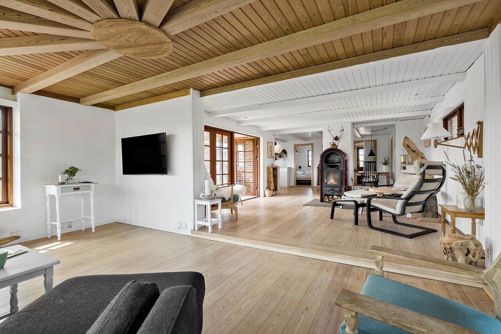 Das reetgedeckte Sommerhaus in Aargab, das im Jahr 2023 umfassend renoviert wurde, bietet auf 125 m² eine stilvolle und helle Unterkunft für bis zu sechs Personen. Die offene Küche beeindruckt mit modernster Ausstattung, darunter ein Geschirrspüler, Elektro-/Gasherd, Backofen, Kühlschrank und eine Kaffeemaschine. Der elegante Wohnbereich verfügt über einen sonnendurchfluteten Erker, einen TV und einen gemütlichen Holzofen. Fußbodenheizung sorgt in allen Räumen für angenehme Wärme. Die drei Schlafzimmer sind jeweils mit Doppelbetten ausgestattet, und das moderne Duschbad rundet die ansprechende Ausstattung ab.