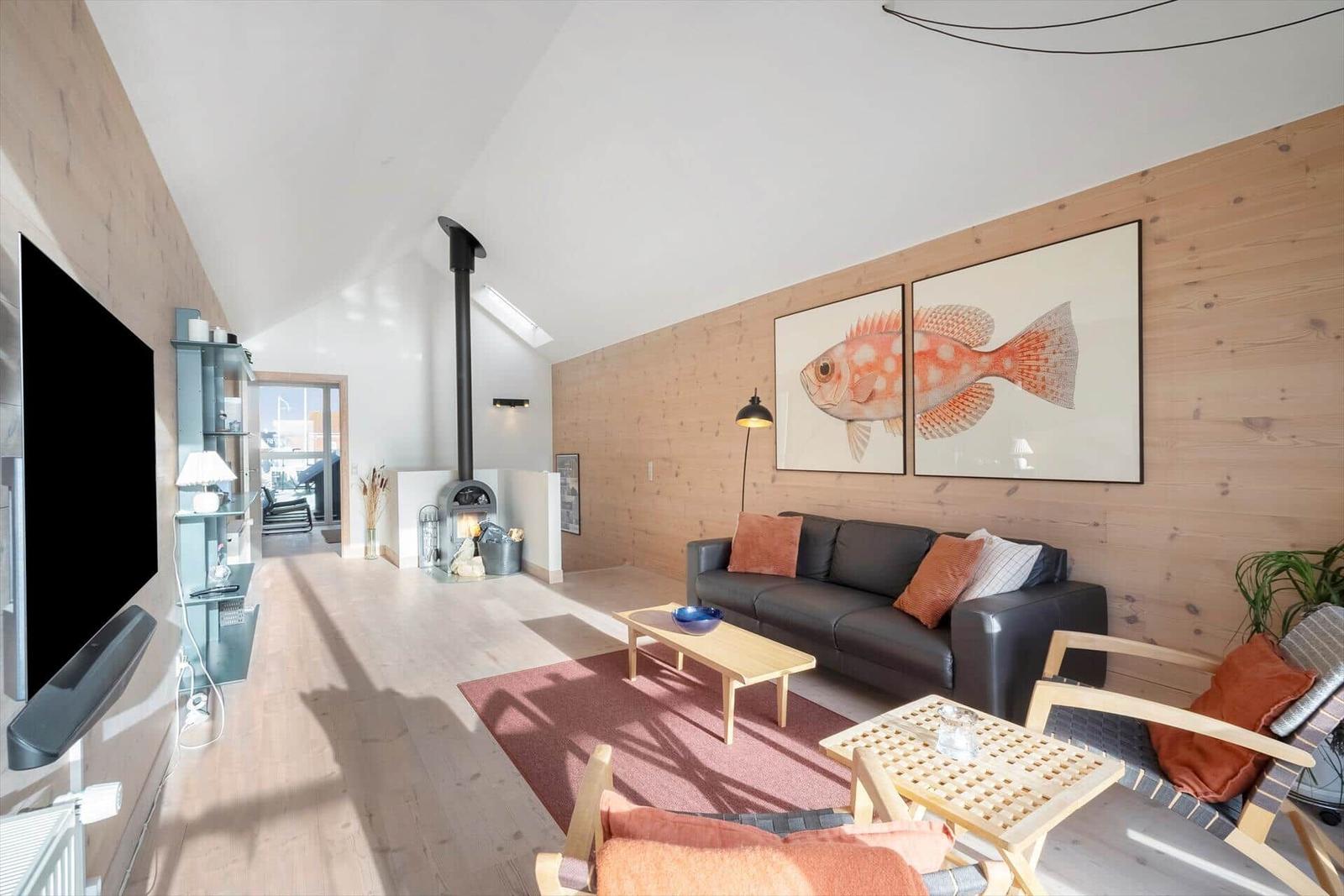 Die Einrichtung zeichnet sich durch eine wohlige Gemütlichkeit aus, inklusive eines einladenden Kamins. Für zusätzlichen Komfort sorgt die Ausstattung mit Waschmaschine, Spülmaschine und Wäschetrockner. Ein besonderes Highlight ist die eigene Sauna, die Entspannung nach einem Tag am nahegelegenen Strand bietet, der nur 50 Meter entfernt ist. Zudem steht kostenloses Internet zur Verfügung. Einkaufsgelegenheiten sind nur 600 Meter entfernt, was diese Unterkunft zu einem idealen Rückzugsort macht.