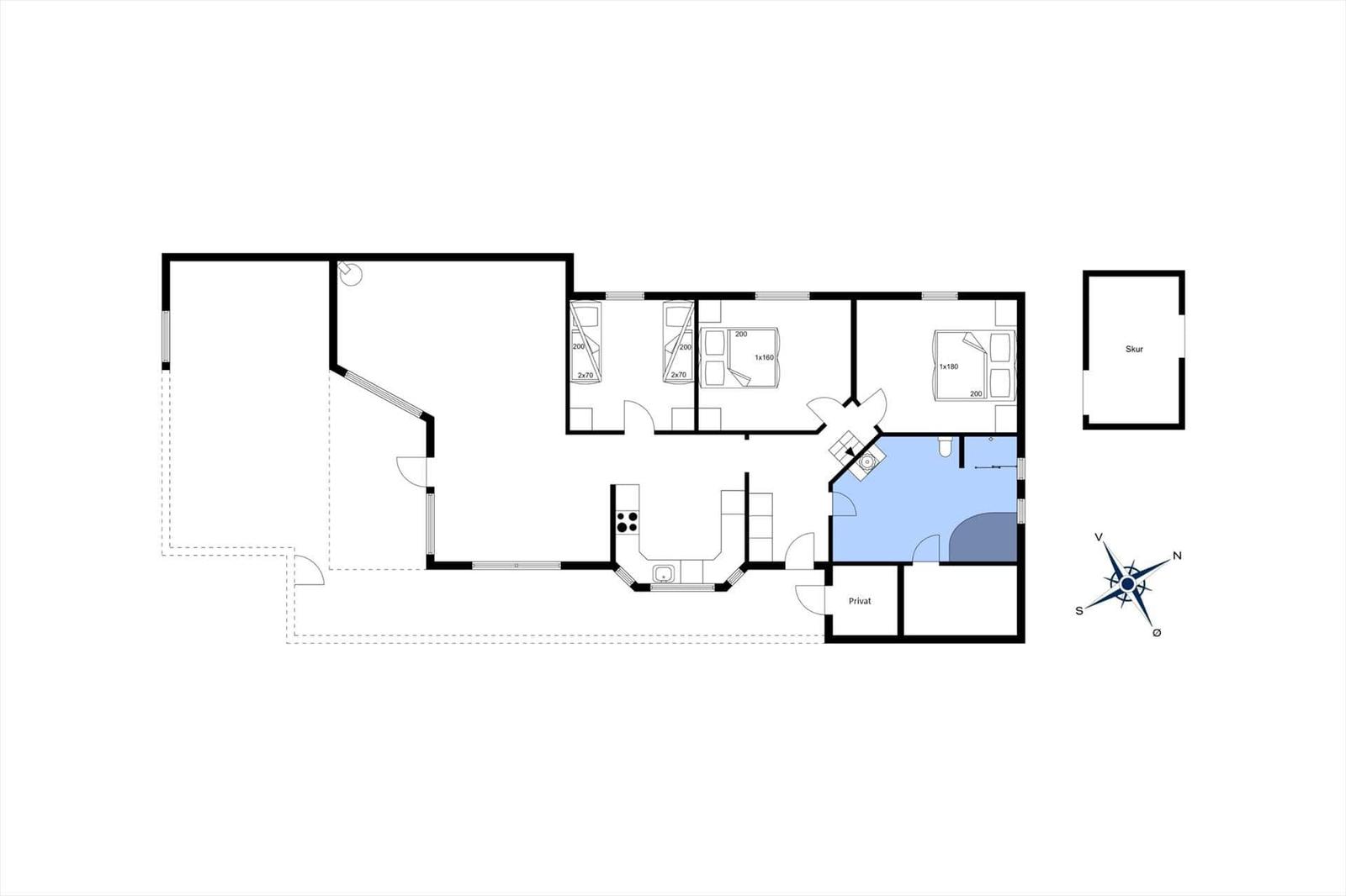 Die Ferienwohnung in Klitmøller, Nordjütland, bietet auf 104 m² Platz für bis zu 8 Erwachsene und 2 Haustiere. Die gemütliche Einrichtung umfasst ein Wohnschlafzimmer mit Kamin sowie drei Schlafzimmer, in denen sich zwei Doppelbetten befinden. Ein modernes Duschbad sorgt für Komfort.