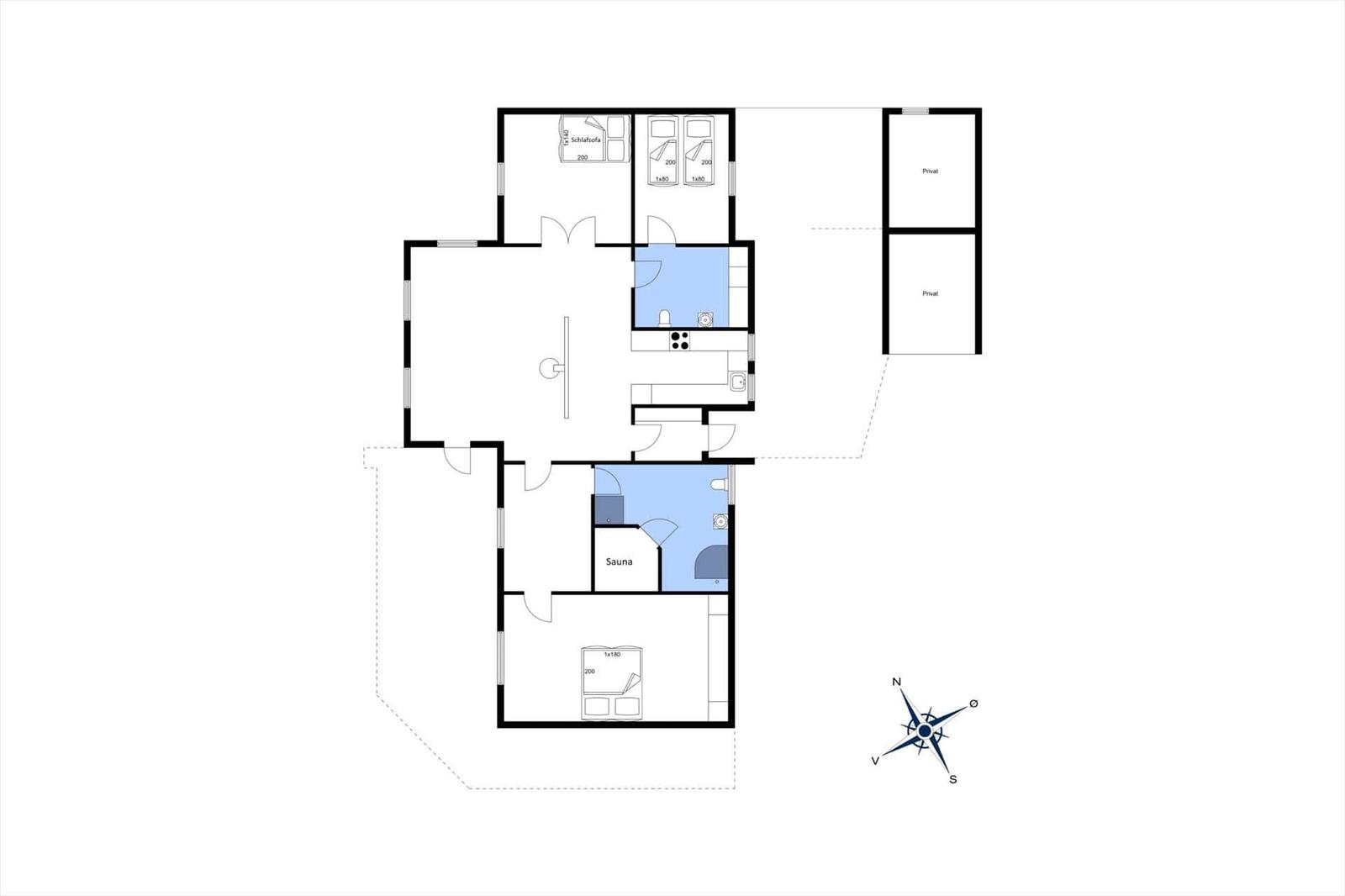 Das Ferienhaus verfügt über 3 Schlafzimmer mit 1 Doppelbett, 2 Einzelbetten und 2 Kinderbetten sowie ein Wohnschlafzimmer mit einer Schlafcouch. Das Duschbad ist zeitgemäß gestaltet. Auf dem 1.600 m² großen Grundstück stehen eine Schaukel und ein Sandkasten für Kinder bereit. Zusätzlich zur Nähe zum Strand (20 m) und Einkaufsmöglichkeiten (630 m) können Gäste eine Sauna nutzen.