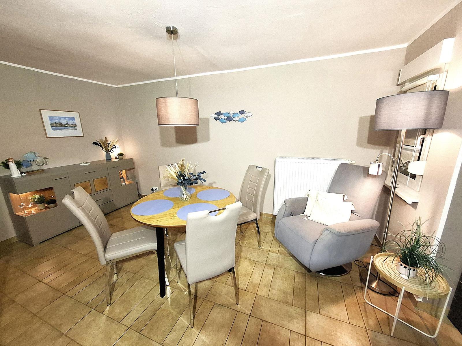 In einer einladenden Ferienwohnung finden Gäste alles, was sie für einen komfortablen Aufenthalt benötigen. Die offene Küche ist modern ausgestattet und bietet einen Geschirrspüler, Elektro-/Gasherd, Backofen, Mikrowelle sowie einen Kühlschrank mit Gefriermöglichkeit. Ein Esstisch lädt zum gemeinsamen Genießen ein. Das Wohnschlafzimmer mit einem gemütlichen Sofa und einer Schlafcouch sorgt für erholsame Nächte, während das separate Schlafzimmer mit einem Doppelbett Ruhe und Entspannung verspricht.