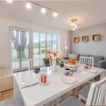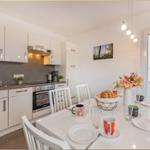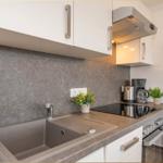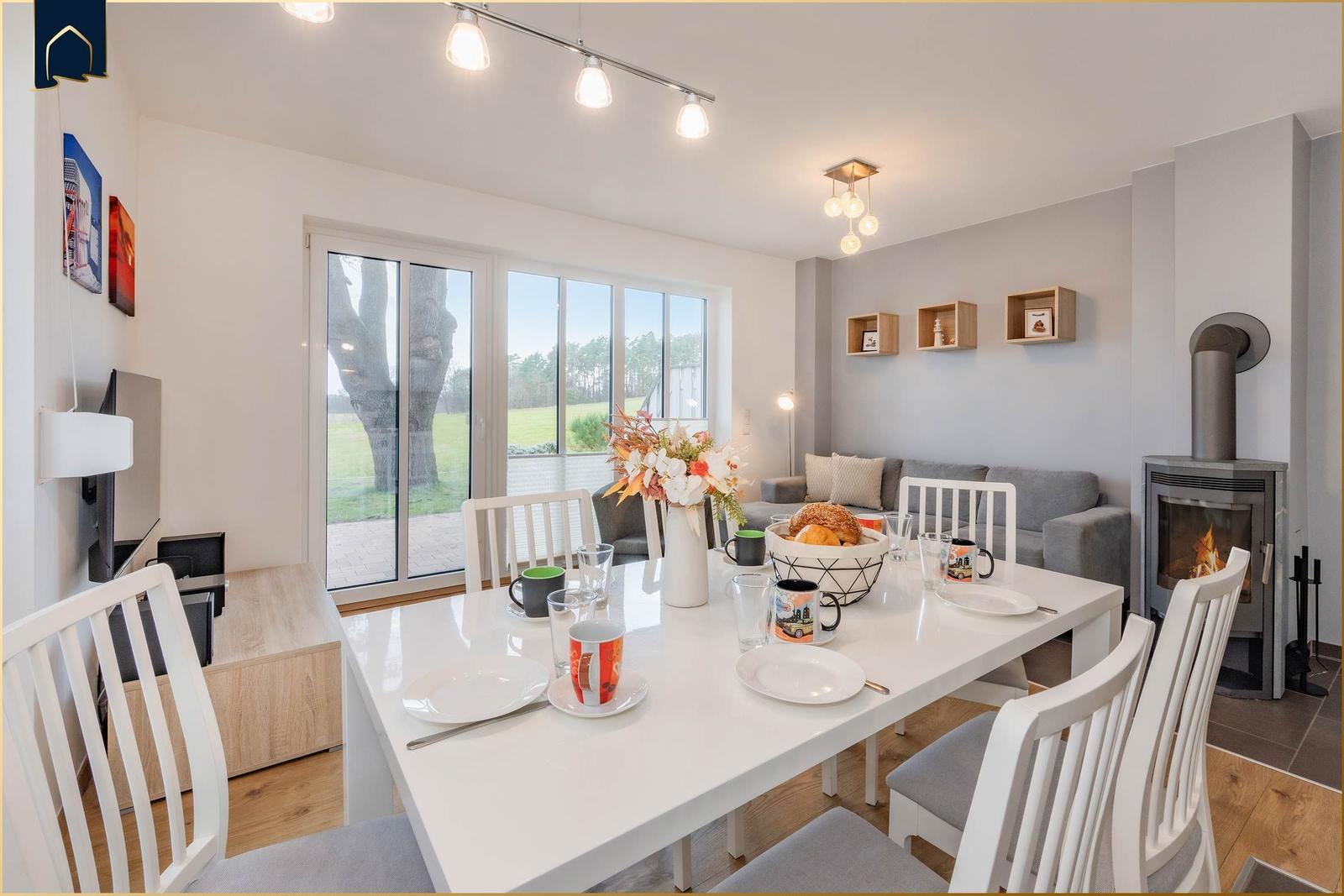 Die offene Küche ist mit einem Geschirrspüler, Elektro-/Gasherd, Backofen, Mikrowelle und Kühlschrank ausgestattet und bietet alle notwendigen Gerätschaften, einschließlich einer Kaffeemaschine und einem Starterset an Gewürzen. Der großzügige Esstisch lädt zu gemeinsamen Mahlzeiten ein.