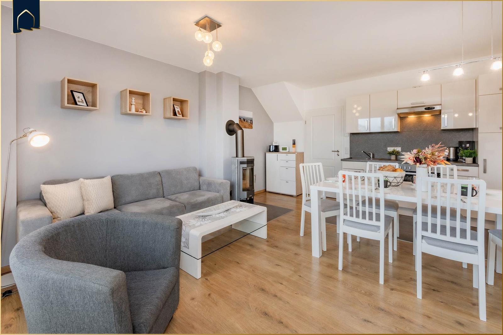 Das Wohnzimmer mit Kamin oder Kachelofen, TV und HiFi-Anlage schafft eine gemütliche Atmosphäre. WLAN sorgt für ständige Verbindung. Die Wohnung ist allergikergeeignet und verfügt über einen Parkplatz sowie eine Waschmaschine. Ein Wasserkocher, Toaster und Staubsauger sind ebenfalls vorhanden, um den Aufenthalt noch angenehmer zu gestalten.