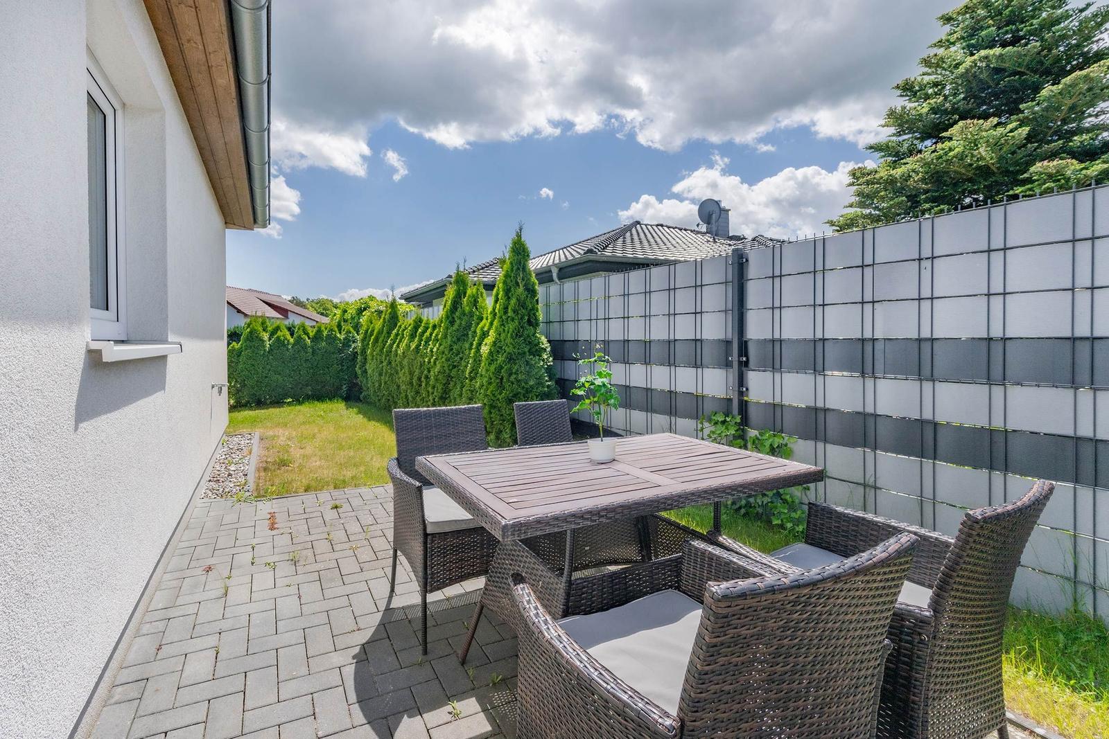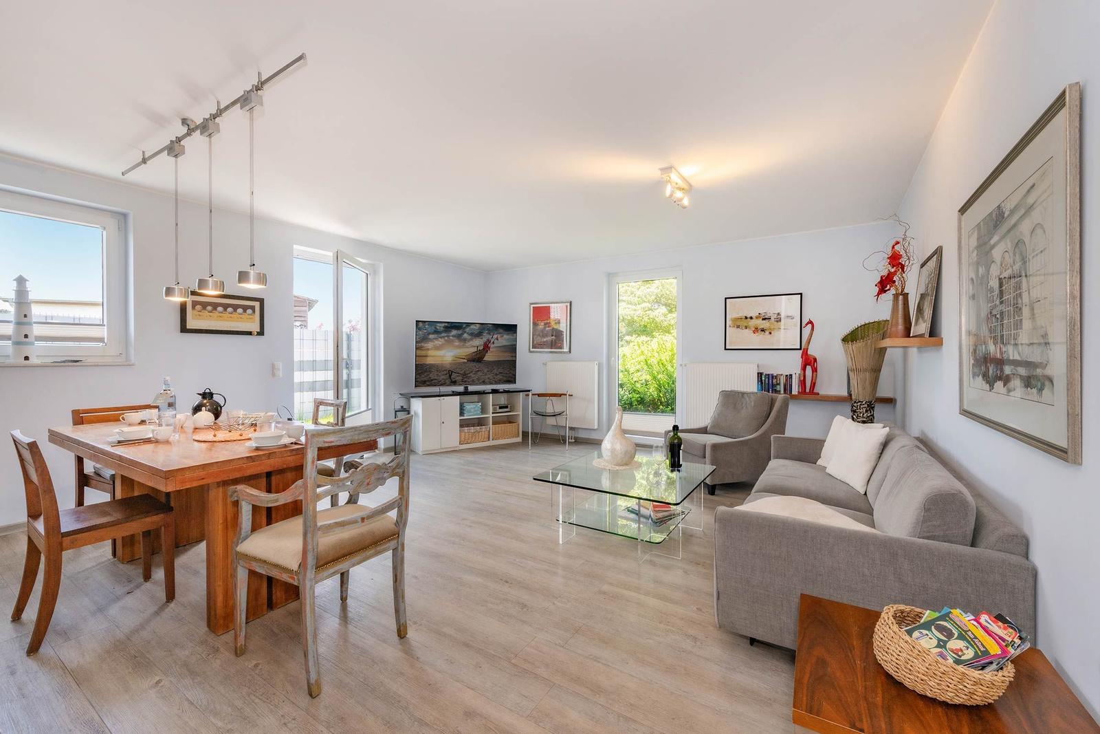 Das Ferienhaus "Haus Sandkorn" in Korswandt auf Usedom bietet auf 86 m² eine harmonische Verbindung von Komfort und Erholung. Die offene Wohnküche ist mit hochwertigen Geräten wie Backofen, Spülmaschine und Mikrowelle ausgestattet und lädt zu kulinarischen Erlebnissen ein. Der angrenzende Wohnbereich verfügt über einen Esstisch und einen Flat-TV mit Netflix, ideal für entspannte Abende. Es gibt zwei stilvolle Schlafzimmer, beide mit Doppelbetten (1,80 m x 2,00 m) und Verdunklungsmöglichkeit, sowie ein modernes Badezimmer mit Dusche und Badewanne. Zudem steht ein separates Gäste-WC zur Verfügung. Eine Grundausstattung ist bereits vorhanden, und das kostenfreie WLAN ermöglicht jederzeitige Internetnutzung. Ein eigener Stellplatz und ein abschließbarer Fahrradraum runden das Angebot ab, um die Umgebung bequem zu erkunden.