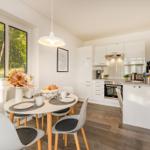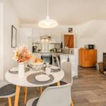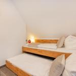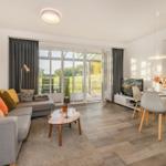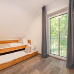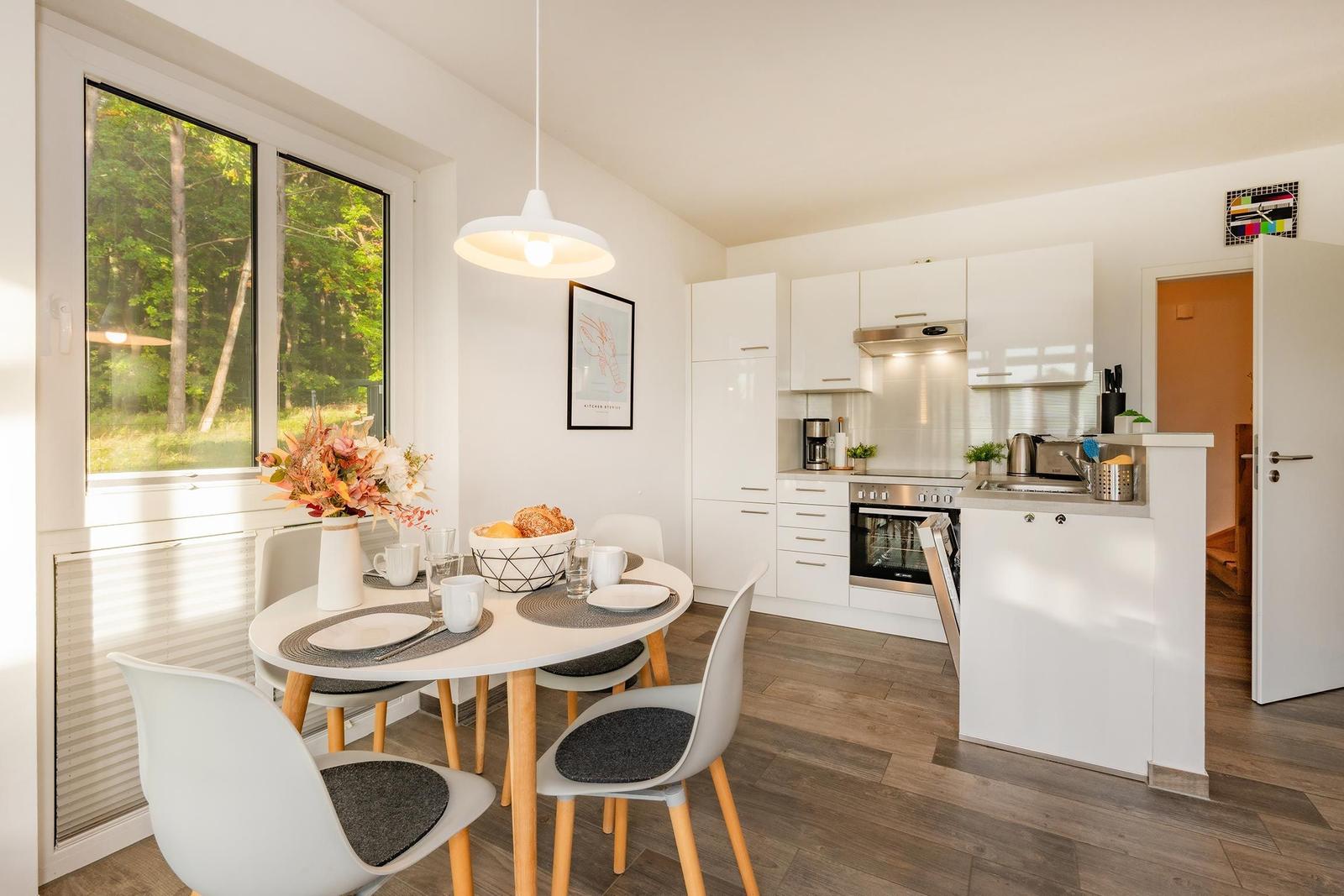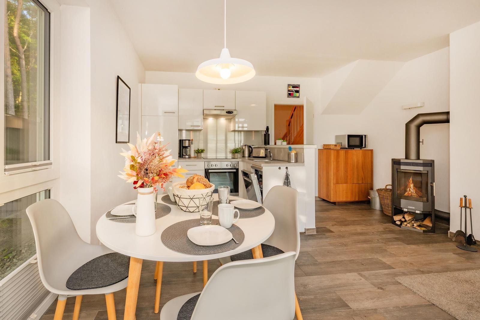 Das charmante Ferienhaus Amber bietet auf 70 m² einen offenen Wohnbereich mit einer modernen, voll ausgestatteten Küche, einschließlich Backofen, Ceranfeld, Mikrowelle und Geschirrspüler. Ein einladender Esstisch sowie ein geschmackvoll eingerichteter Wohnraum mit Flat-TV und Kamin sorgen für Gemütlichkeit. Der Rückzugsort verfügt über zwei komfortable Schlafzimmer: das Hauptschlafzimmer mit Doppelbett (1,80 m x 2,00 m) und das zweite mit ausziehbaren Einzelbetten. Zwei moderne Badezimmer bieten zusätzliche Annehmlichkeiten, darunter eine Badewanne mit Sauna und eine Dusche mit bodengleichem Einstieg. Eine Grundausstattung mit frischen Betten und Handtüchern ist vorhanden, sowie kostenfreies WLAN. Ein PKW-Stellplatz befindet sich direkt am Haus. Für kleine Gäste stehen ein Babyreisebett und Hochstuhl bereit.