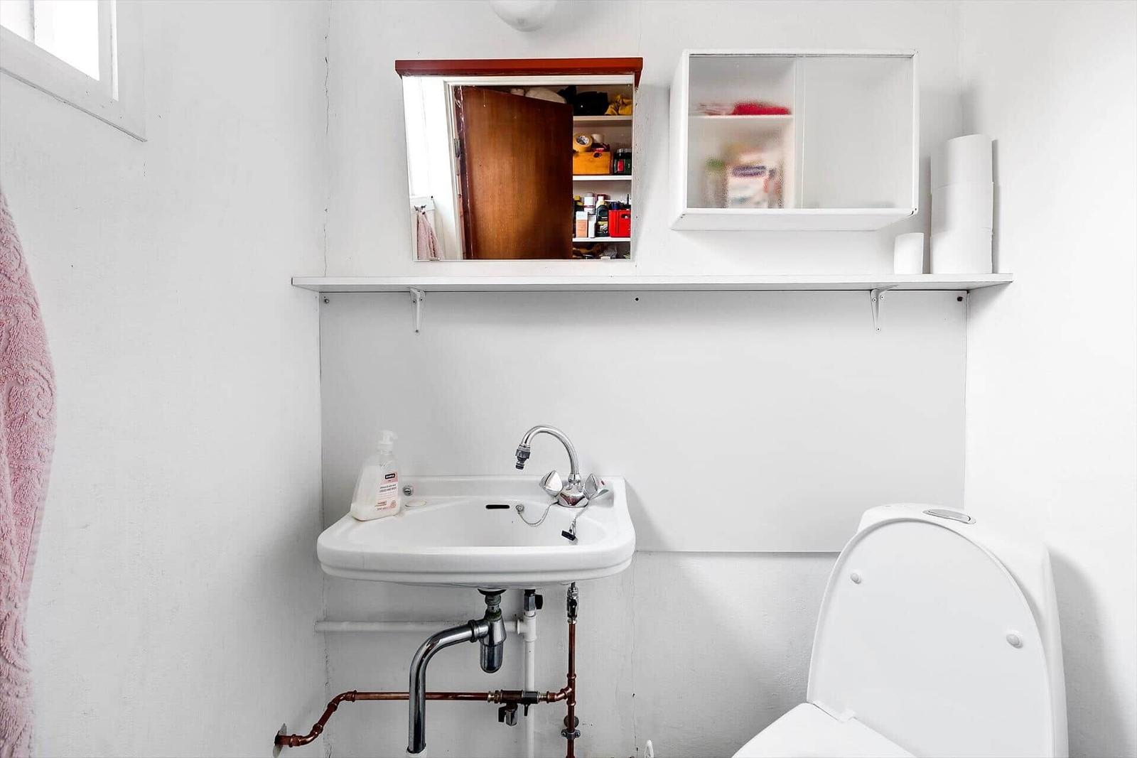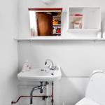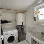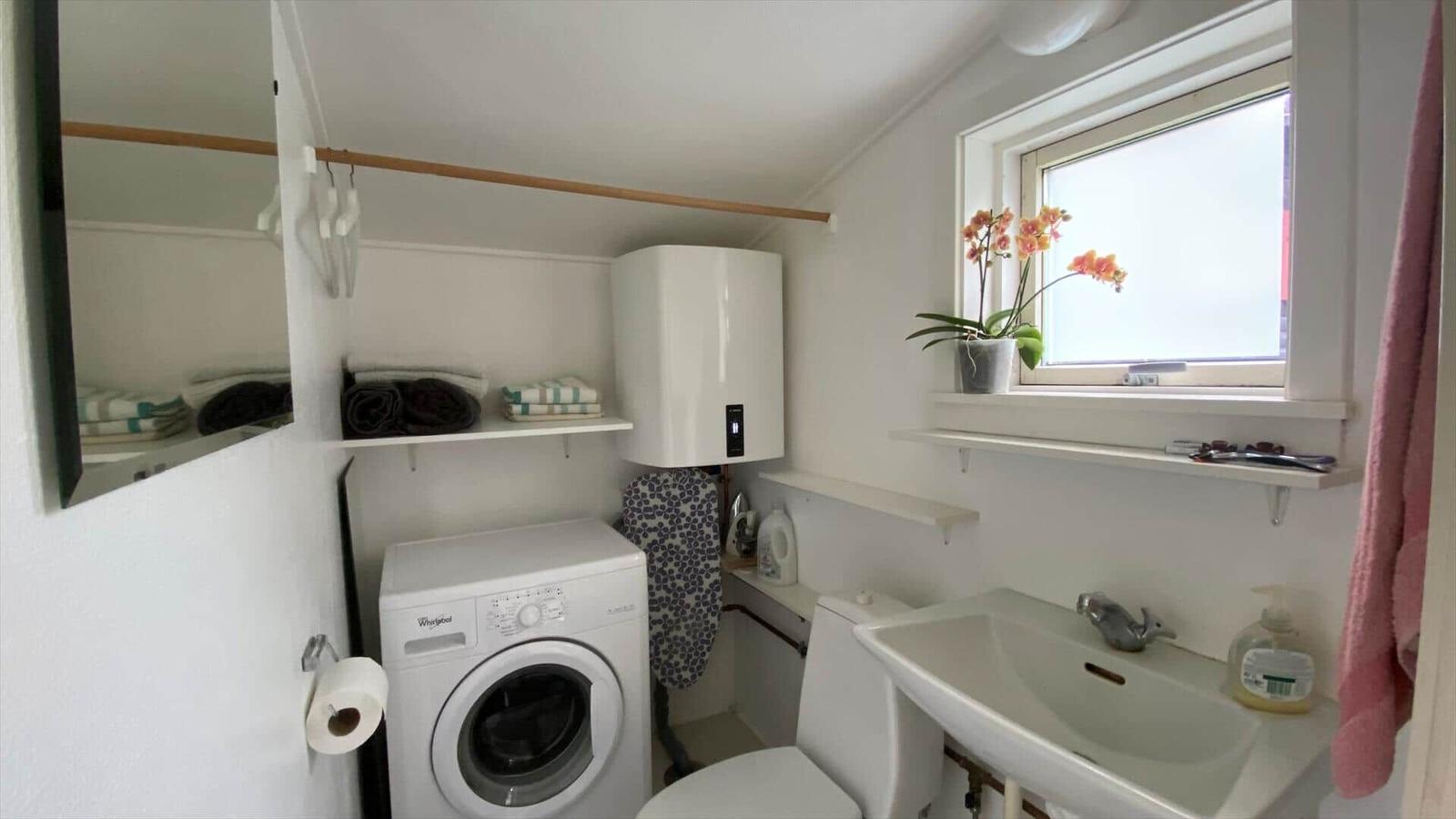 Das Badezimmer ist mit einer Duschbadewanne ausgestattet. Zudem bietet die Wohnung praktische Annehmlichkeiten wie eine Waschmaschine und ein Bügeleisen.