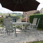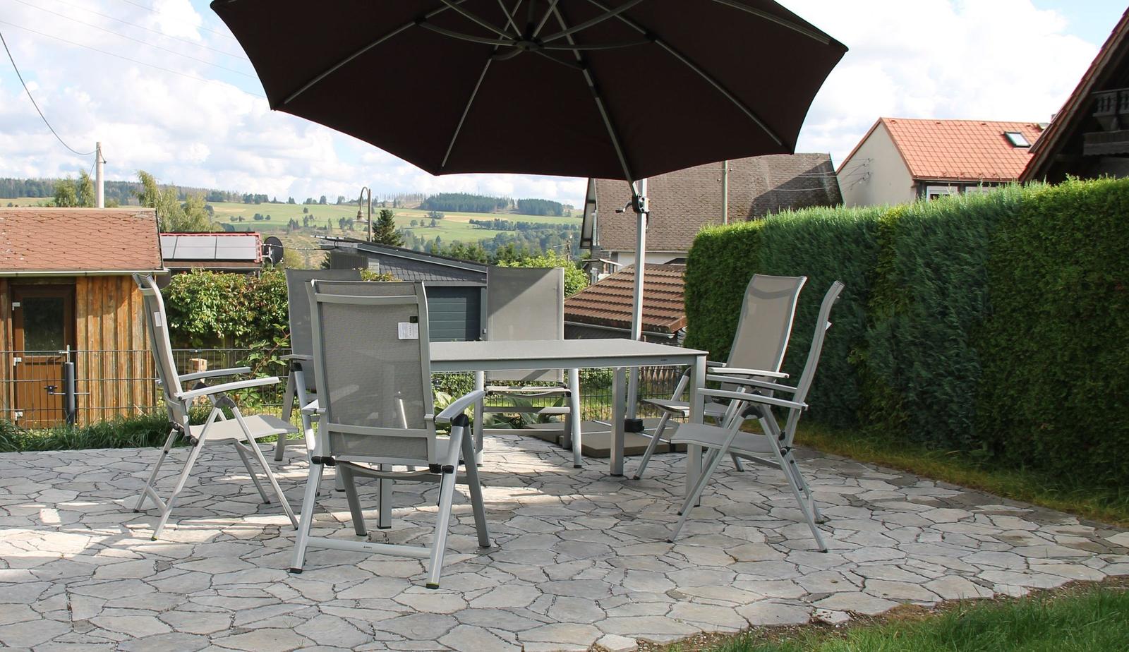 Terrasse mit Gartenmöbeln, schwenkbarem Sonnenschirm