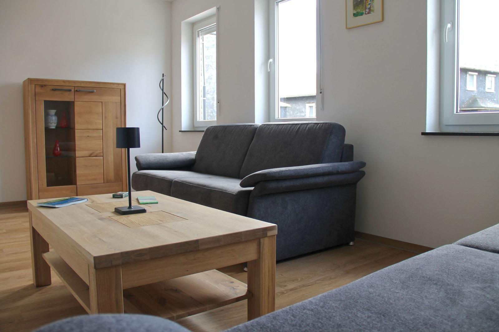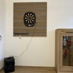 Im Wohnzimmer lädt eine gemütliche Sofaecke zum Entspannen ein. Bücher, Spiele und eine elektronische Dartscheibe sorgen für Unterhaltung. Über den Glasfaseranschluss steht schnelles Internet für Streaming und Arbeit bereit.