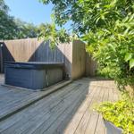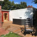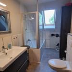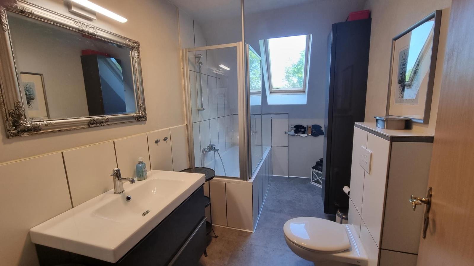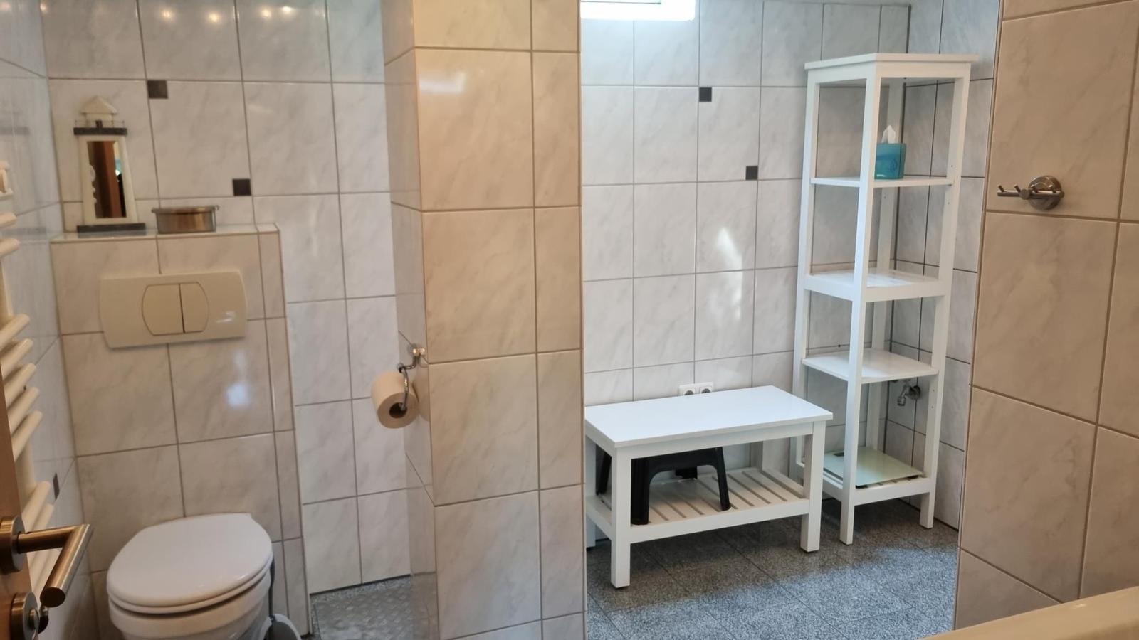Es gibt 2 Badezimmer im Haus. Eines mit Dusche und eines mit Badewanne. Der Whirlpool und die Sauna sind im Garten.