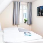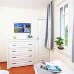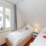 Über eine Wendeltreppe gelangen Sie in das Obergeschoss. Zwei komfortabel eingerichtete Schlafzimmer erwarten sie hier. Eines ist mit einem Doppelbett, das zweite mit zwei Einzelbetten ausgestattet. In beiden Zimmern befindet sich je ein geräumiger Kleiderschrank für Ihre Urlaubsgarderobe sowie ein zusätzliches Fernsehgerät.