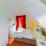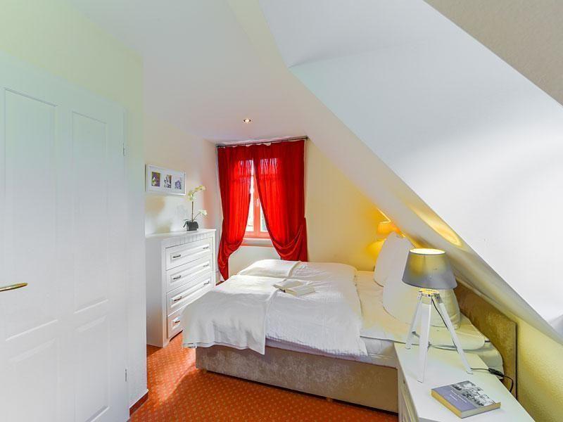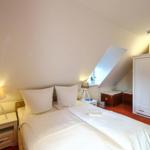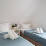 Über eine Wendeltreppe gelangen Sie in das Obergeschoss. Hier befinden sich die beiden Schlafzimmer. Eines ist mit einem komfortablen Doppelbett ausgestattet, das zweite mit zwei Einzelbetten. In beiden Zimmern befindet sich je ein geräumiger Kleiderschrank für Ihre Urlaubsgarderobe.