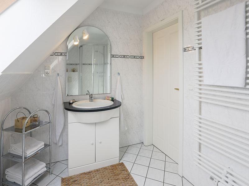 Das moderne Badezimmer verfügt über eine Dusche, ein WC, ein Waschbecken mit Unterschrank sowie einen Handtuchheizkörper.