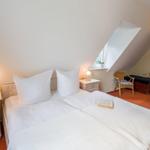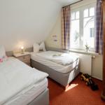 Über eine Wendeltreppe gelangen Sie in das Obergeschoss. Hier befinden sich zwei Schlafzimmer, eines mit einem komfortablen Doppelbett, das zweite mit zwei Einzelbetten eingerichtet. Beide Zimmer sind ausgestattet mit je einem geräumigen Kleiderschrank.