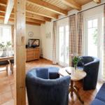 Im Erdgeschoss befindet sich das modern und mit viel Liebe zum Detail eingerichtete Wohnzimmer. Zwei Sessel und eine komfortable Couchgarnitur sorgen für Behaglichkeit. Die Couchgarnitur ist ausziehbar und mit wenigen Handgriffen zu einer Schlafgelegenheit für 2 Personen umfunktioniert.