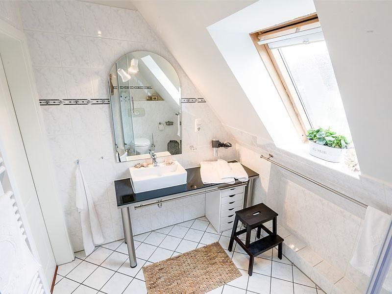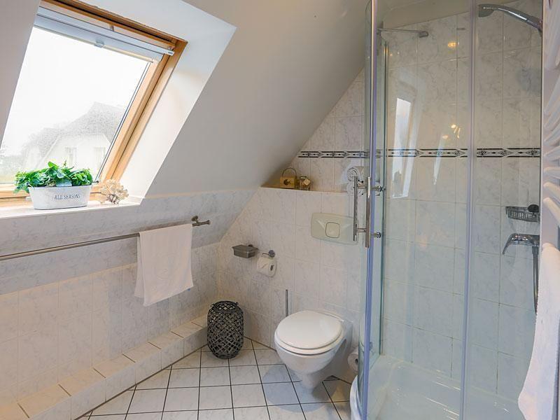Ebenfalls auf dieser Ebene befindet sich das modern eingerichtete Badezimmer, es ist mit einer Dusche, einem WC, einem Aufsatzwaschbecken mit darunter liegenden Regalen für Ihre Badutensilien sowie einem Handtuchheizkörper ausgestattet.