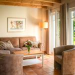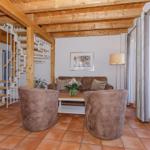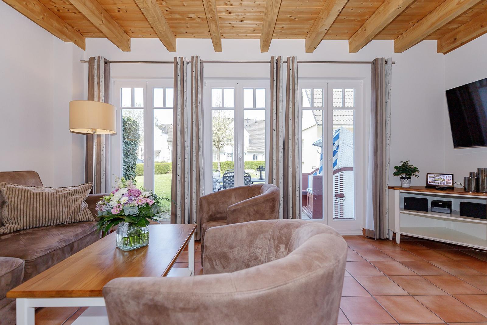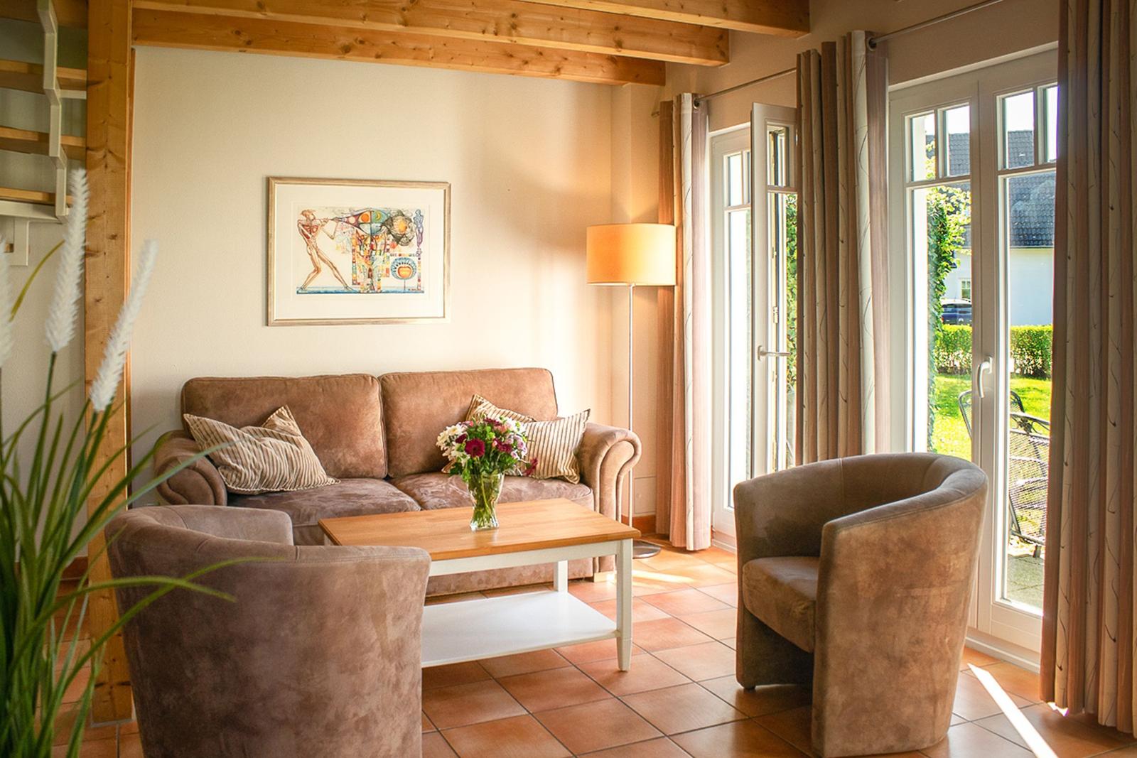 Im Erdgeschoss befindet sich der geschmackvoll möblierte Wohnbereich als Mittelpunkt für ein gemütliches Beisammensein mit der ganzen Familie. Es ist mit zwei bequemen Sesseln und einer komfortablen Sofa-Garnitur ausgestattet. Diese ist ausziehbar und schnell zu einer Schlafmöglichkeit für 2 Personen umfunktioniert.