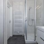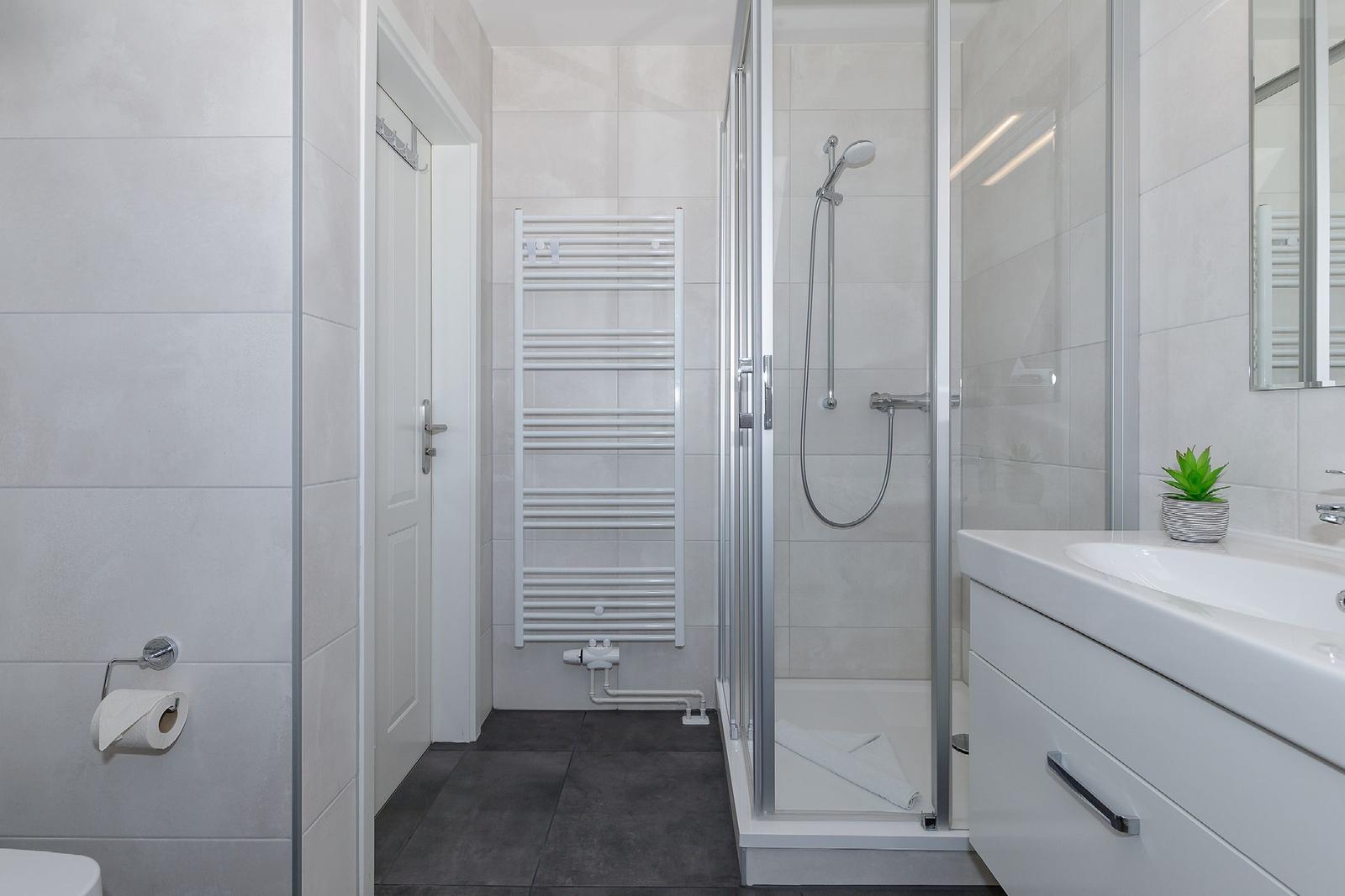 Das hochwertige Badezimmer auf dieser Ebene verfügt über eine Dusche, ein WC, ein Waschbecken mit Schubladenunterschrank, einen Handtuchheizkörper sowie ausreichend Ablageflächen für Ihre Badutensilien.