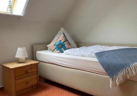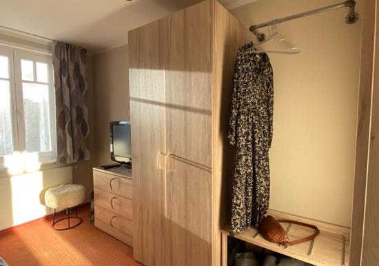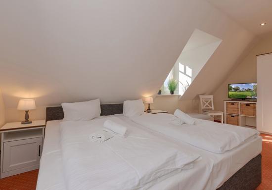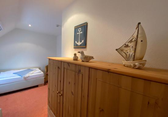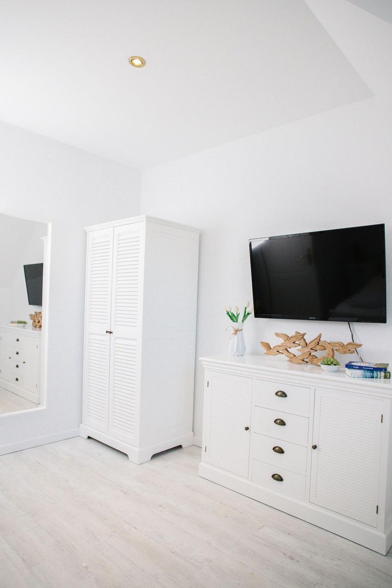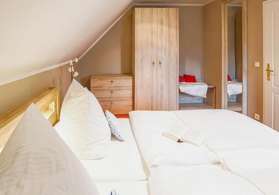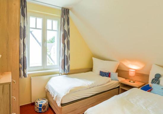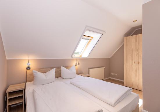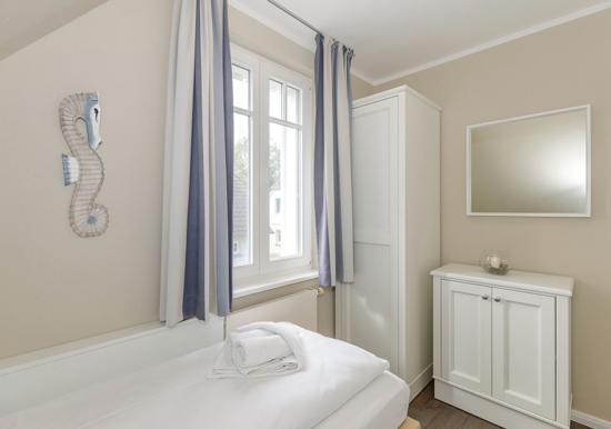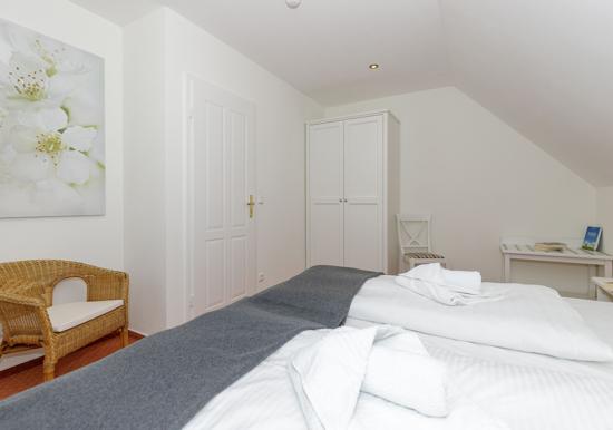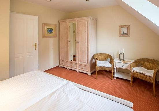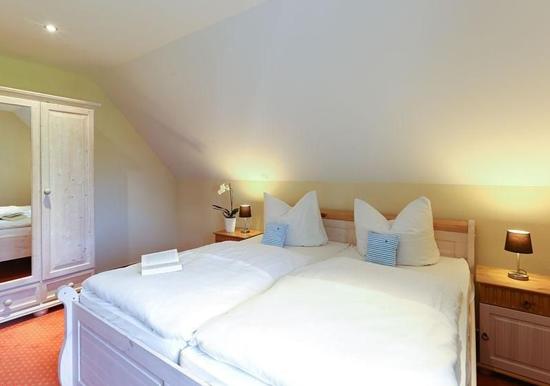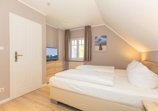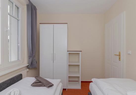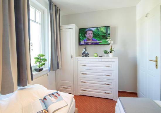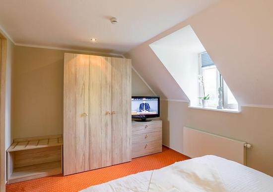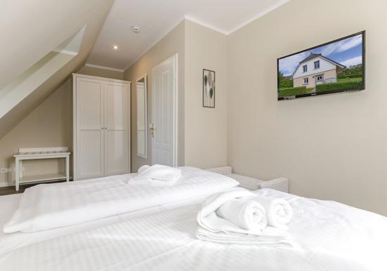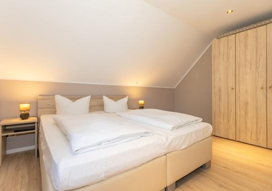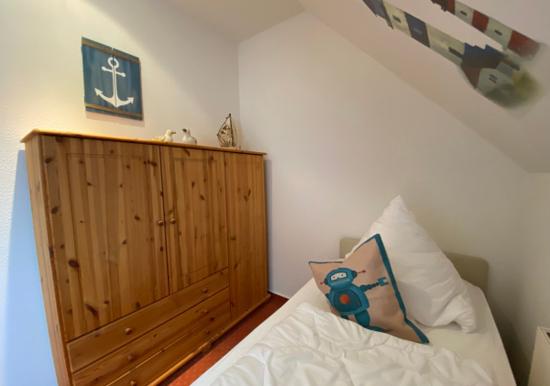 Das zweckmässig eingerichtete Schlafzimmer 1 ist mit einem gemütlichen Doppelbett (200 L x 160 B cm), einem Kleiderschrank, einer Kommode, einem Spiegel, 2 Nachtschränken und einem Fernseher ausgestattet. Im Schlafzimmer/Kinderzimmer befinden sich 2 Einzelbetten, die jeweils zu einem Doppelbett ausgezogen werden können, ein Kleiderschrank und 2 Nachtschränke