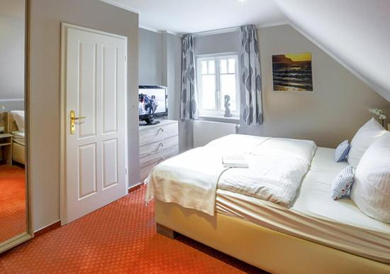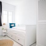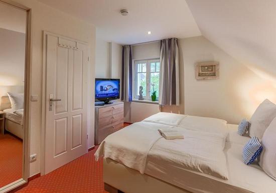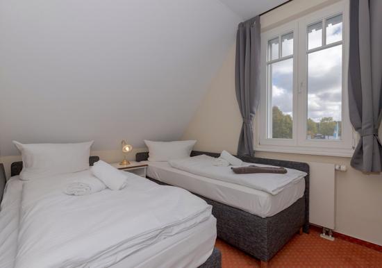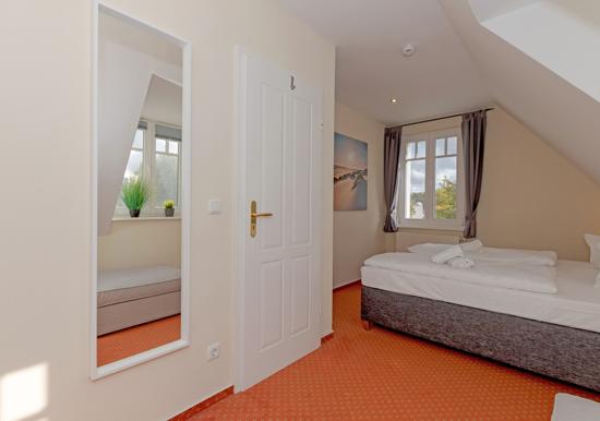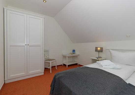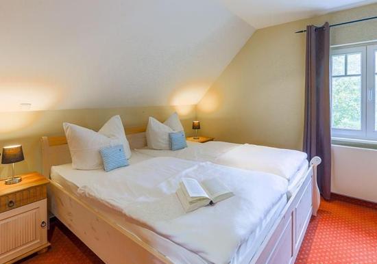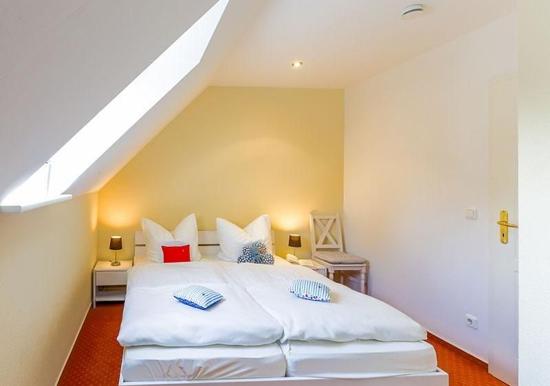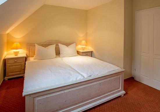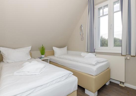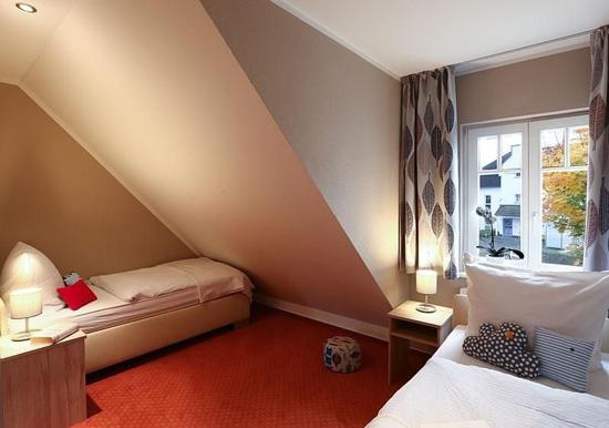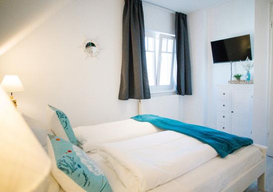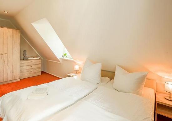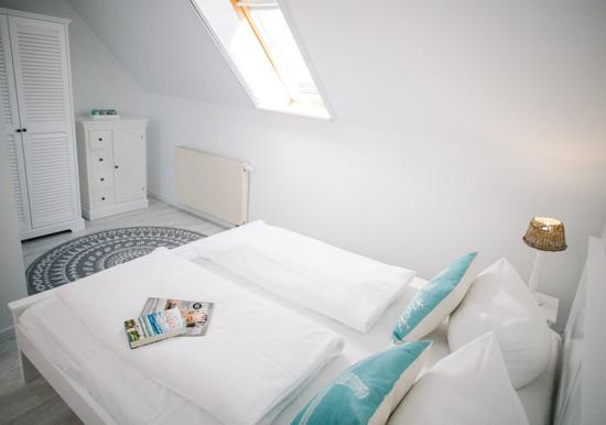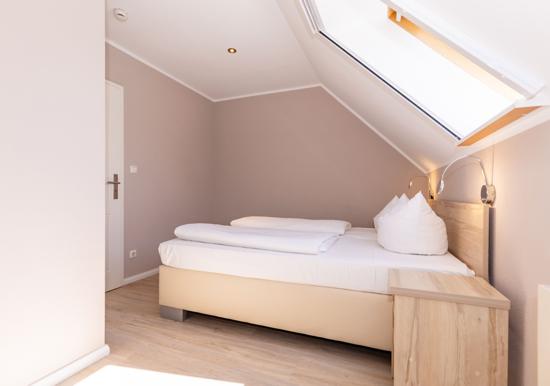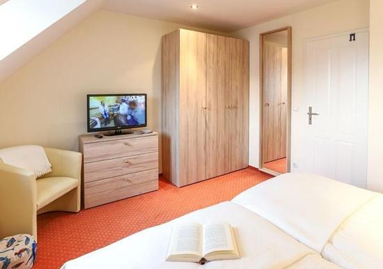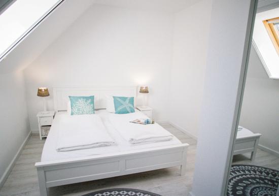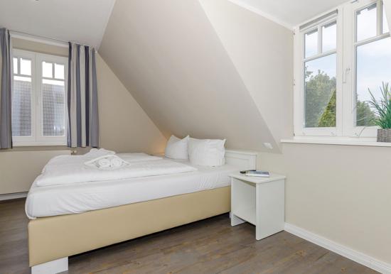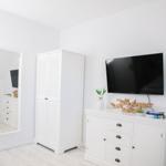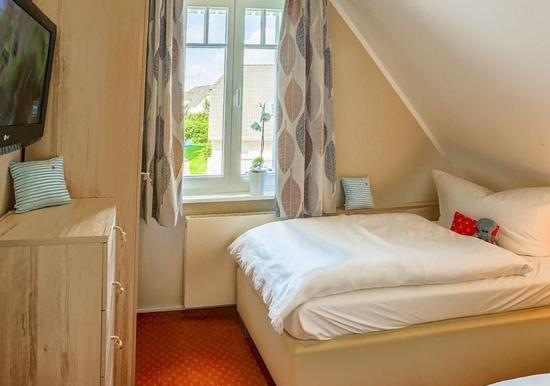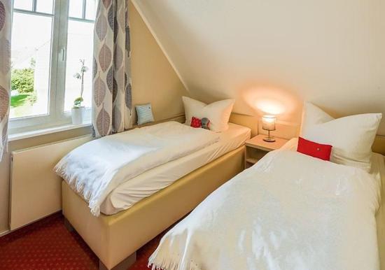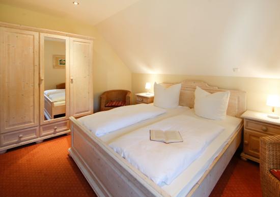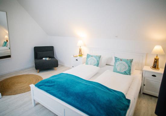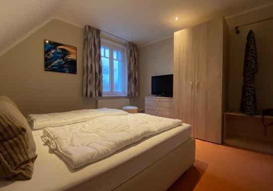 Das zweckmässig eingerichtete Schlafzimmer 1 ist mit einem gemütlichen Doppelbett (200 L x 160 B cm), einem Kleiderschrank, einer Kommode, einem Spiegel, 2 Nachtschränken und einem Fernseher ausgestattet. Im Schlafzimmer/Kinderzimmer befinden sich 2 Einzelbetten, die jeweils zu einem Doppelbett ausgezogen werden können, ein Kleiderschrank und 2 Nachtschränke