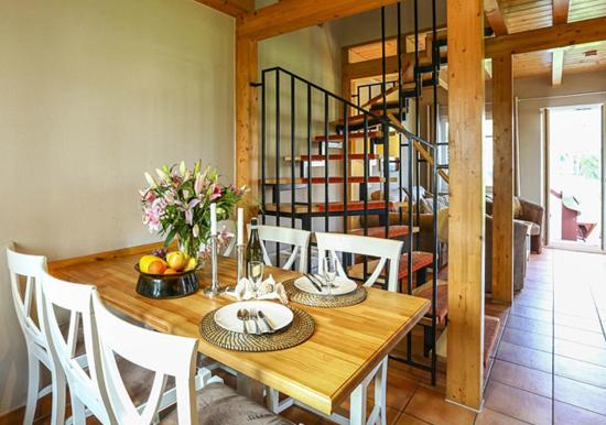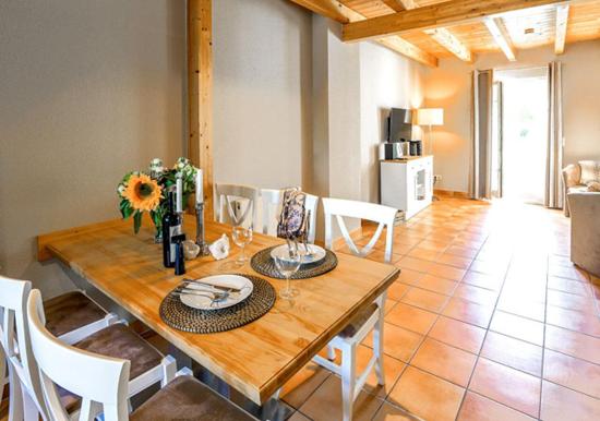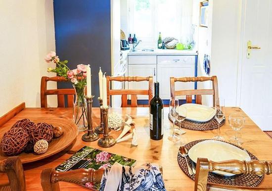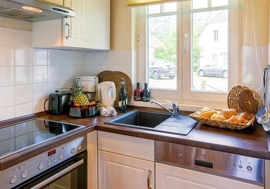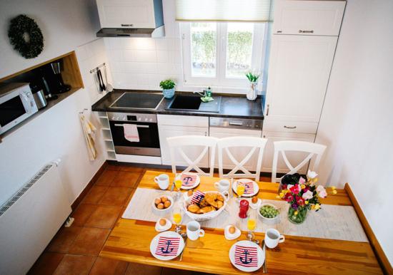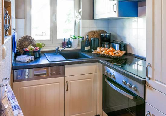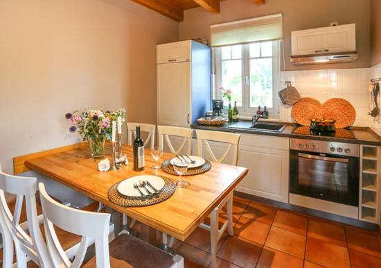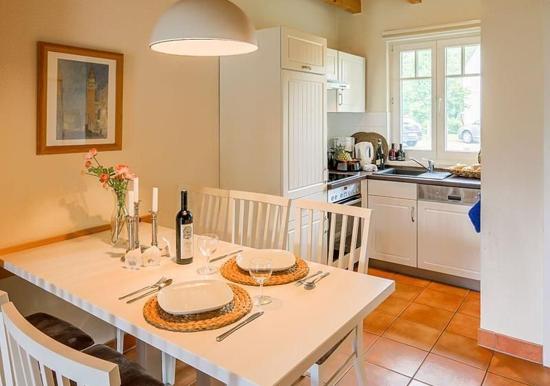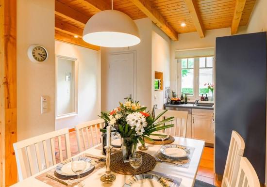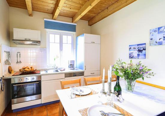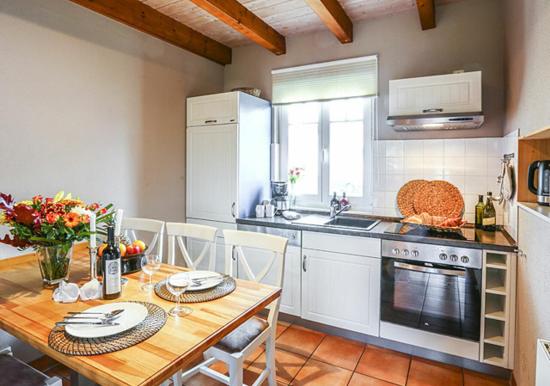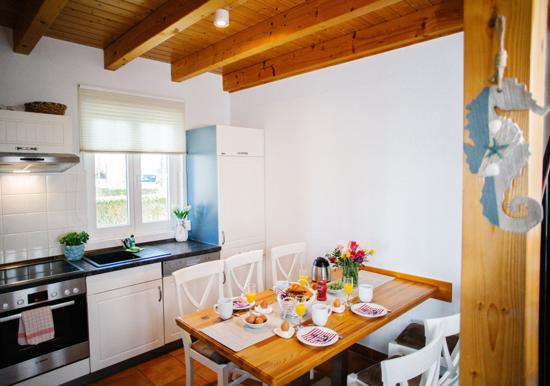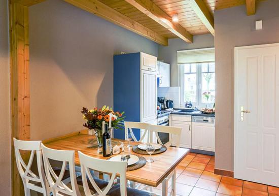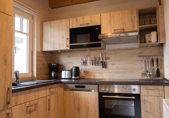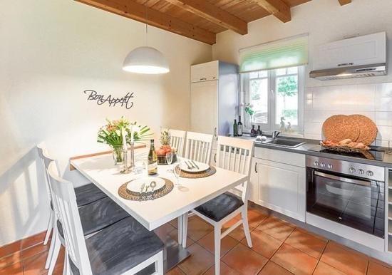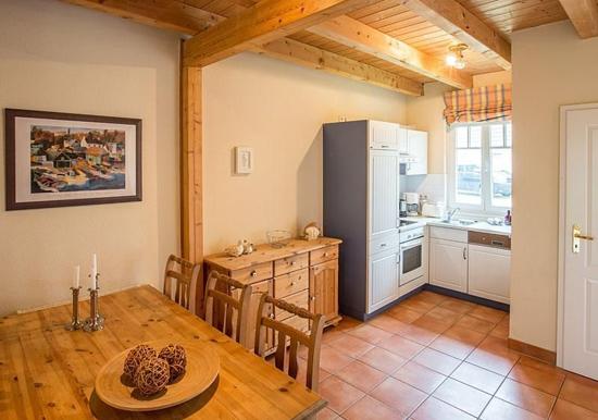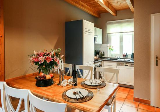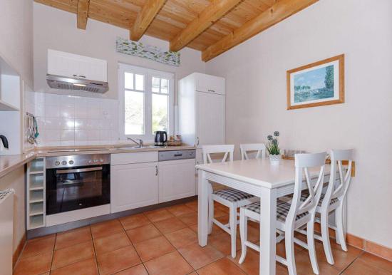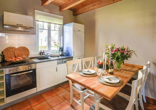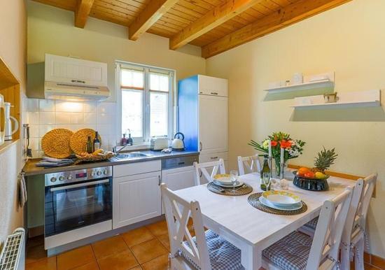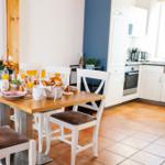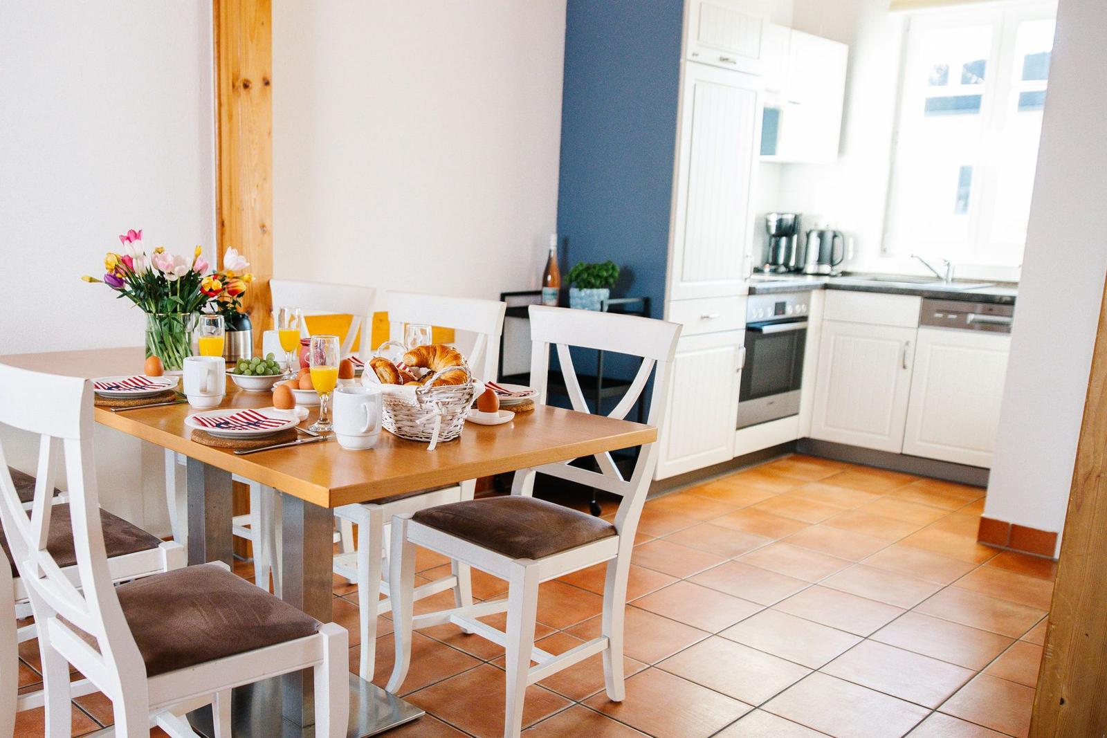 Der große Esstisch und die gut ausgestattete Küchenzeile laden zum gemeinsamen Kochen und Genießen ein.