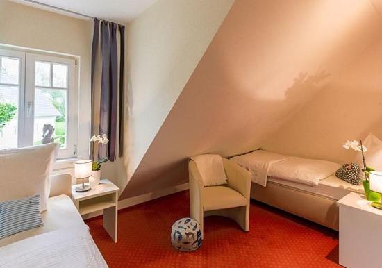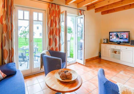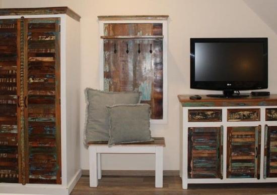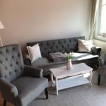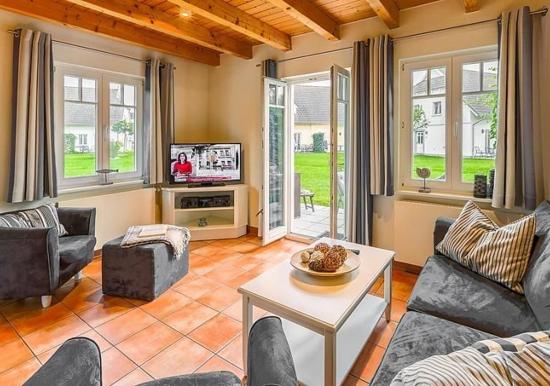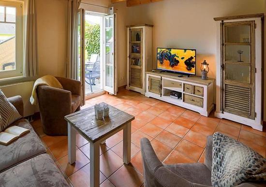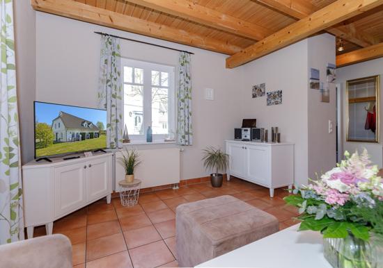 Im Wohnzimmer befinden sich eine Couch, 2 Ohrensessel, 1 Kamin (elektrisch), 1 Fernseher und eine Kommode.