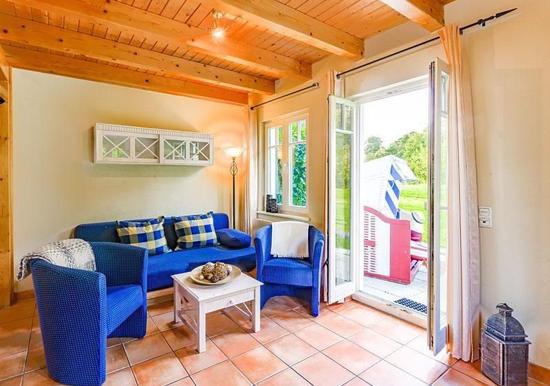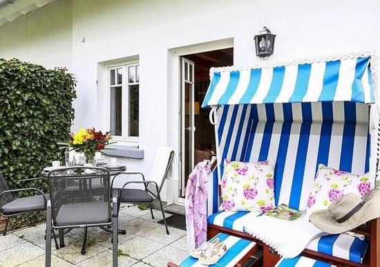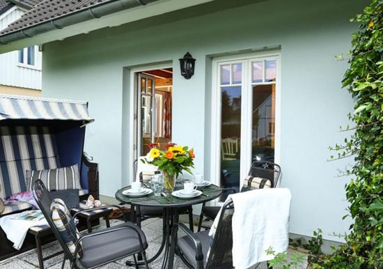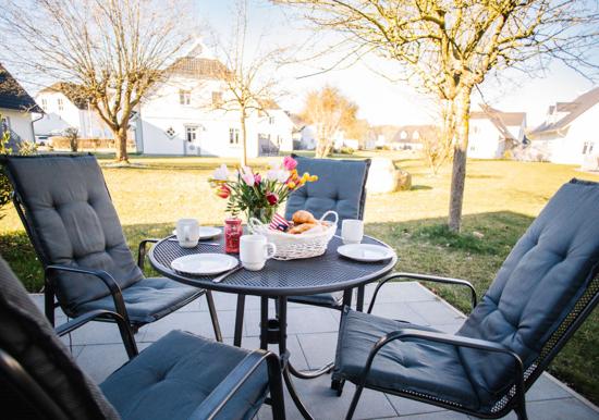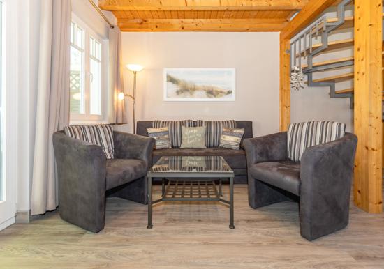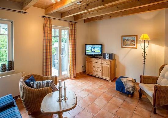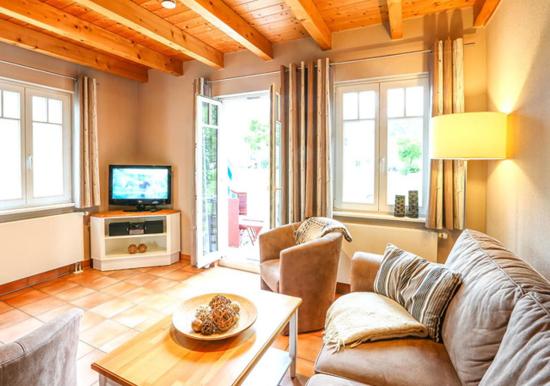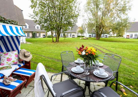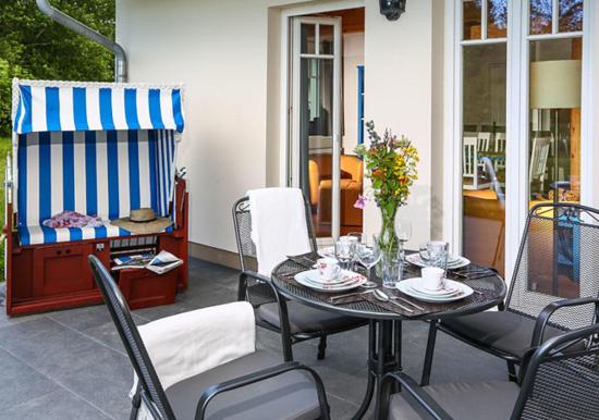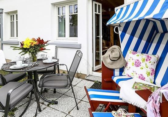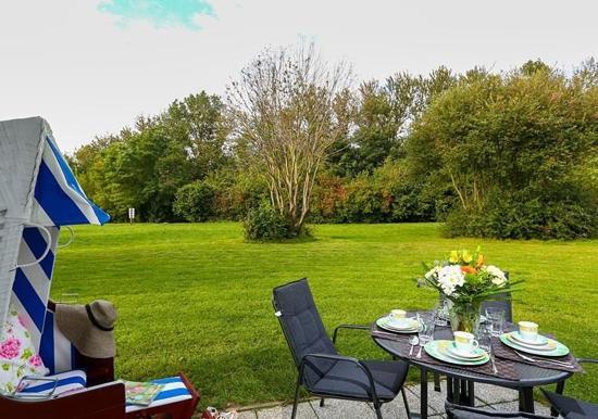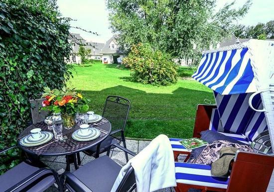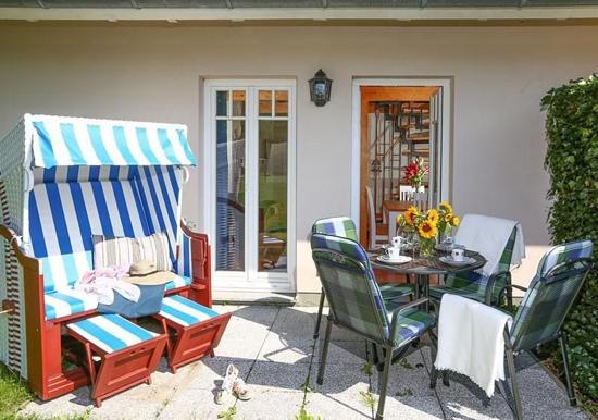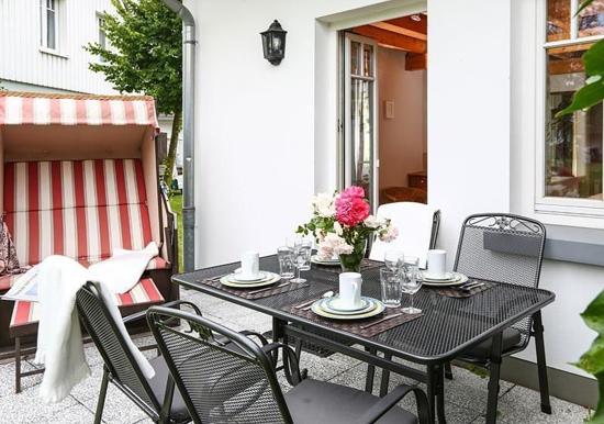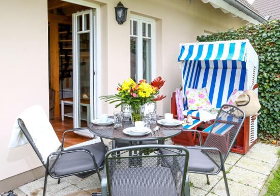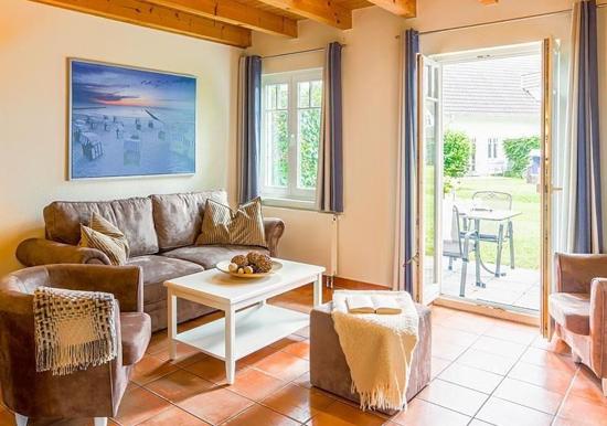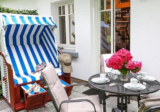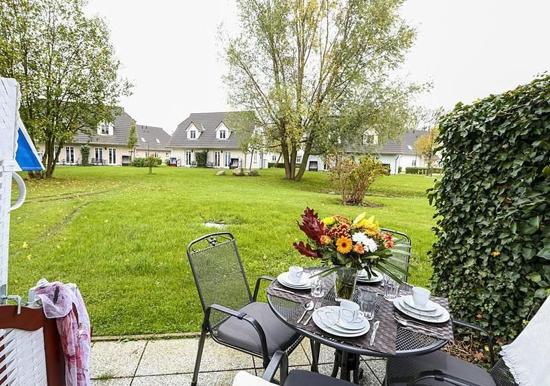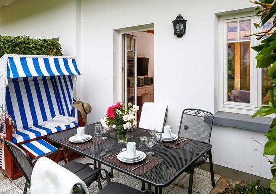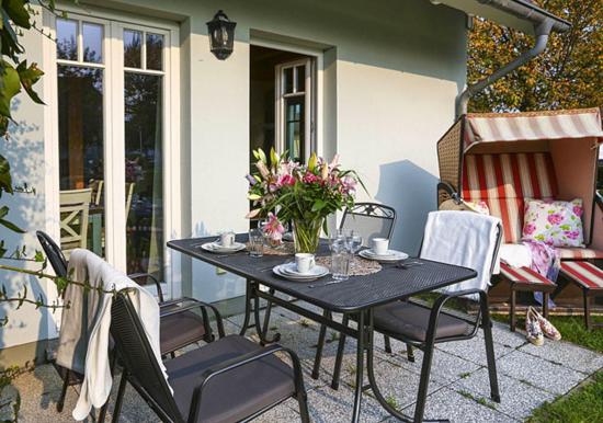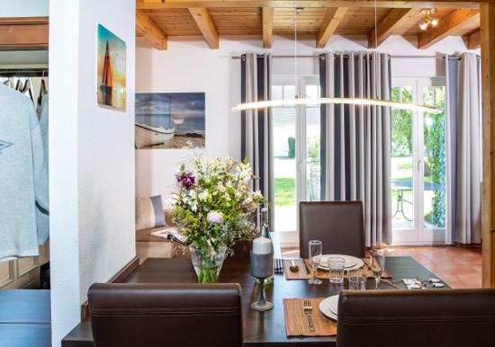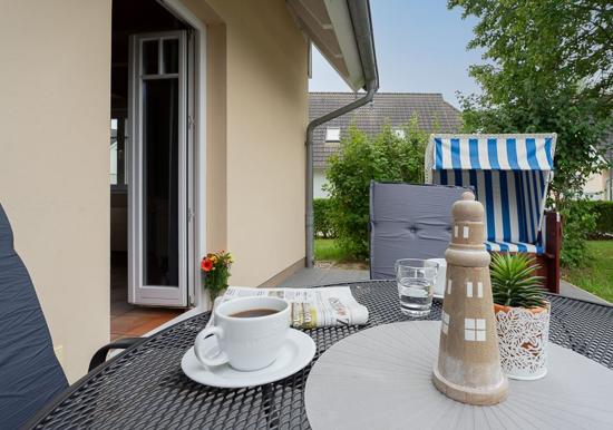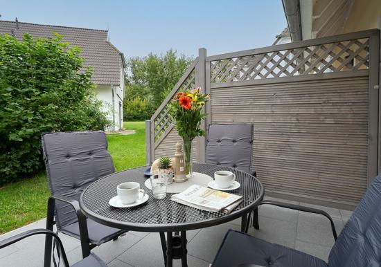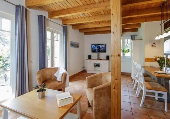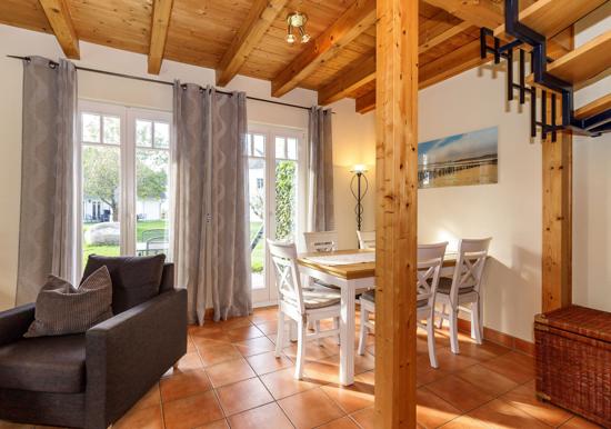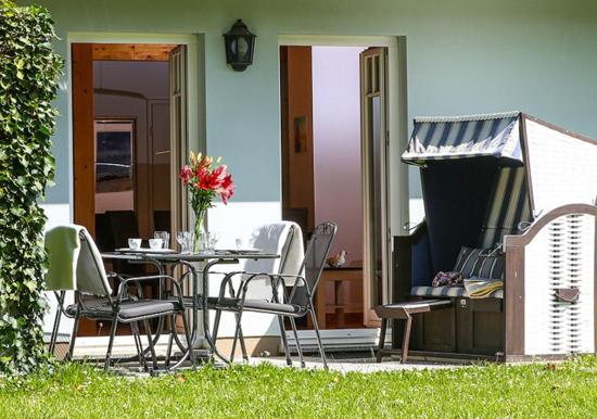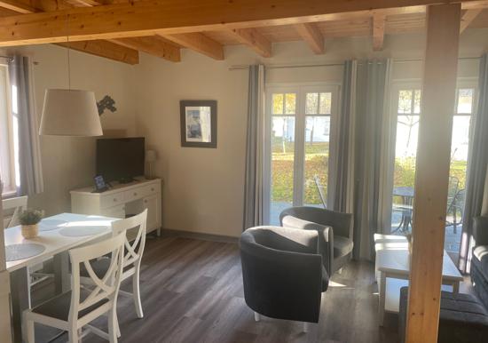 Das Herzstück des Appartements bildet der großzügige Wohn-Essbereich mit der angrenzenden Terrasse und Blick ins Grüne. Auch ein Strandkorb steht auf der Terrasse für Sie bereit.