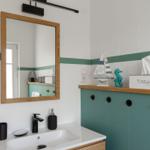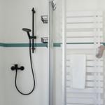 Auf dieser Ebene befindet sich auch das ausgefallene, moderne Badezimmer. Dieses verfügt über eine Dusche, ein WC, einen Handtuchheizkörper sowie ein Waschbecken mit Unterschrank.