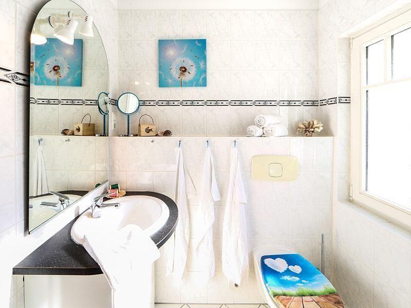 Ebenso im Obergeschoss befindet sich das Badezimmer, ausgestattet mit einer Dusche, einem WC sowie einem Waschbecken mit Unterschrank. Ablageflächen für Ihre Kosmetika sind ebenfalls vorhanden.