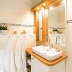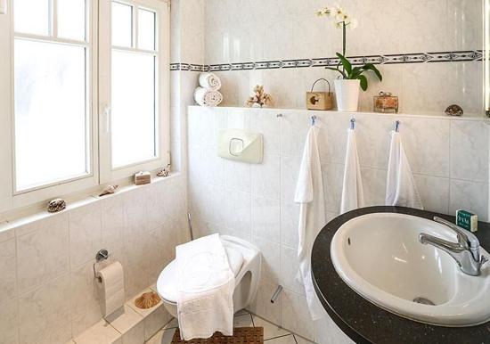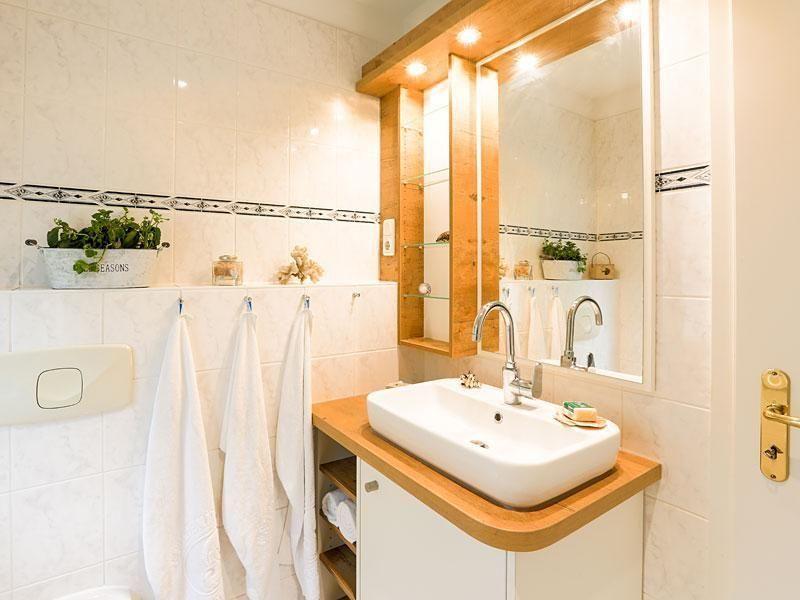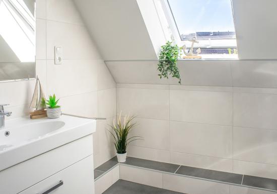 Ebenfalls im Obergeschoss befindet sich das Duschbad. Dieses verfügt über eine Dusche, ein WC, ein Waschbecken mit Unterschrank sowie Ablageflächen für Ihre Kosmetikartikel.