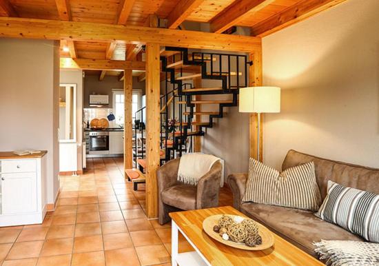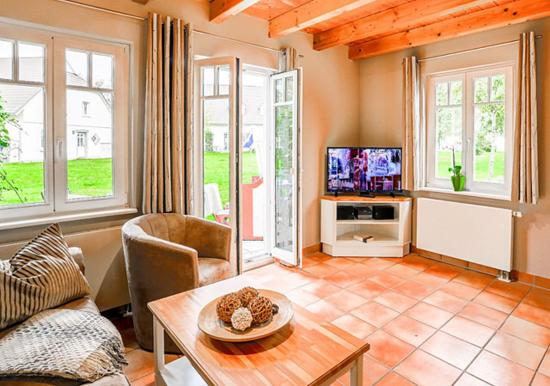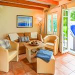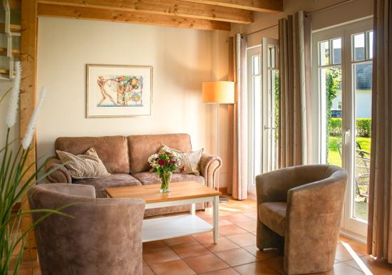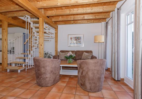 Das gemütliche und liebevoll möblierte, lichtdurchflutete Wohnzimmer im Erdgeschoss lädt die ganze Familie zu unterhaltsamen Stunden ein. Es ist mit zwei Sesseln sowie einer Sofa-Garnitur eingerichtet. Diese ist ausziehbar und kann als Schlafmöglichkeit für 2 Personen genutzt werden.