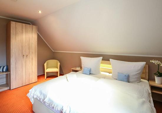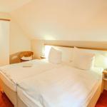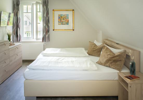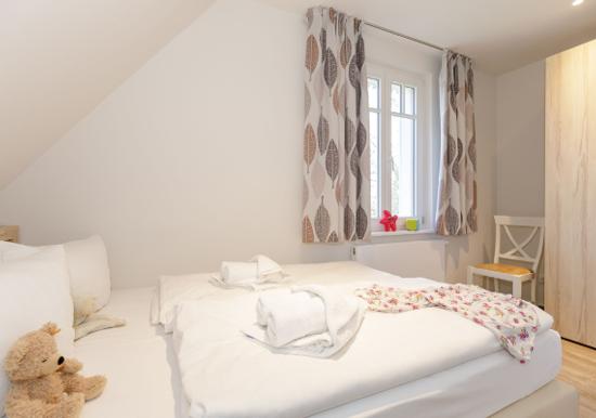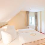 Zwei getrennte Schlafzimmer befinden sich im Obergeschoss, das über eine Wendeltreppe zu erreichen ist. Das eine ist mit einem komfortablen Doppelbett und das zweite mit zwei Einzelbetten ausgestattet, jeweils mit einem geräumigen Kleiderschrank bestückt. Ihre gesamte Urlaubsgarderobe können Sie hier mühelos verstauen.