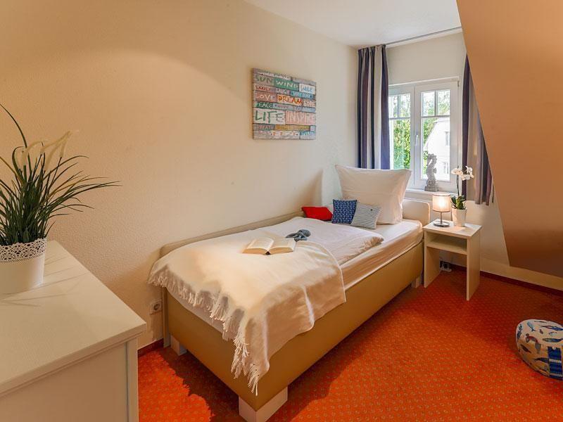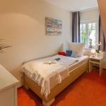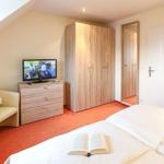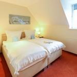 Im Obergeschoss des Hauses, das bequem über eine Wendeltreppe erreichbar ist, befinden sich die beiden Schlafzimmer. Eines ist mit einem bequemen Doppelbett sowie einem zusätzlichen Fernsehgerät eingerichtet, das zweite mit zwei Einzelbetten. Beide Zimmer sind jeweils mit einem geräumigen Kleiderschrank ausgestattet.