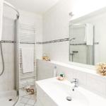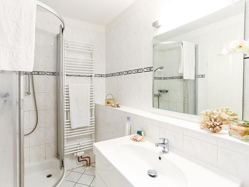 Das Badezimmer auf derselben Etage verfügt über eine Dusche, ein WC, ein Waschbecken mit Unterschrank, einen Handtuch-Heizkörper und Ablageflächen für Ihre Kosmetikartikel.