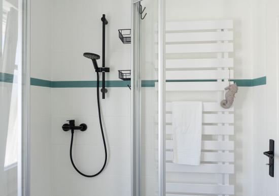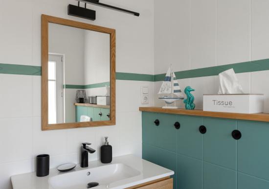 Das exklusive Badezimmer verfügt über eine Dusche, ein WC, ein Waschbecken mit Unterschrank sowie ausreichend Abstellflächen für Ihre Badutensilien.