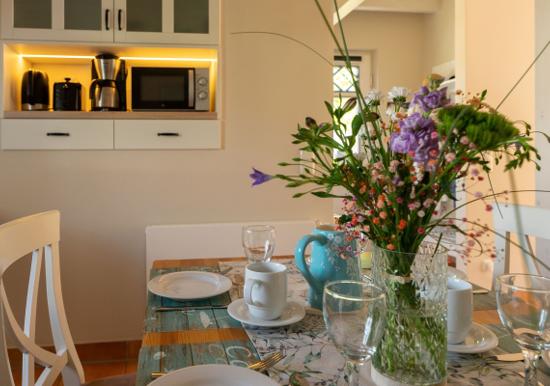 Im Anschluss an das Wohnzimmer folgt der offene Küchenbereich, hier steht Ihnen ein Esstisch für die gemeinsamen Mahlzeiten zur Verfügung. Die voll ausgestattete Küche ist modern eingerichtet und lässt keine Wünsche offen.